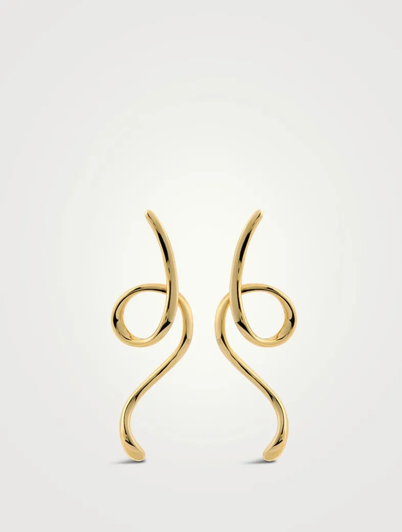 These sculptural ribbon-shaped statement earrings from the Dezi x Luv Aj collection feature swirled, long metal studs with waterproof, tarnish-free 14K gold plating. Made with hypoallergenic surgical steel posts, they’re 100% nickel- and cadmium-free.