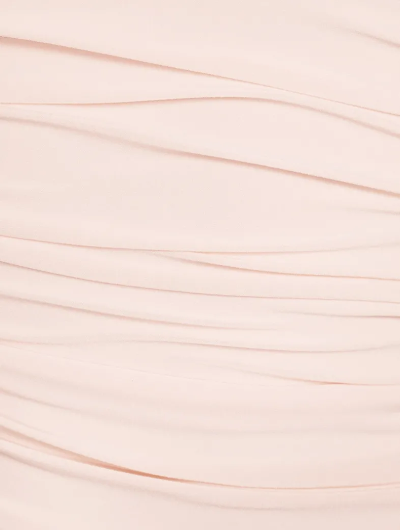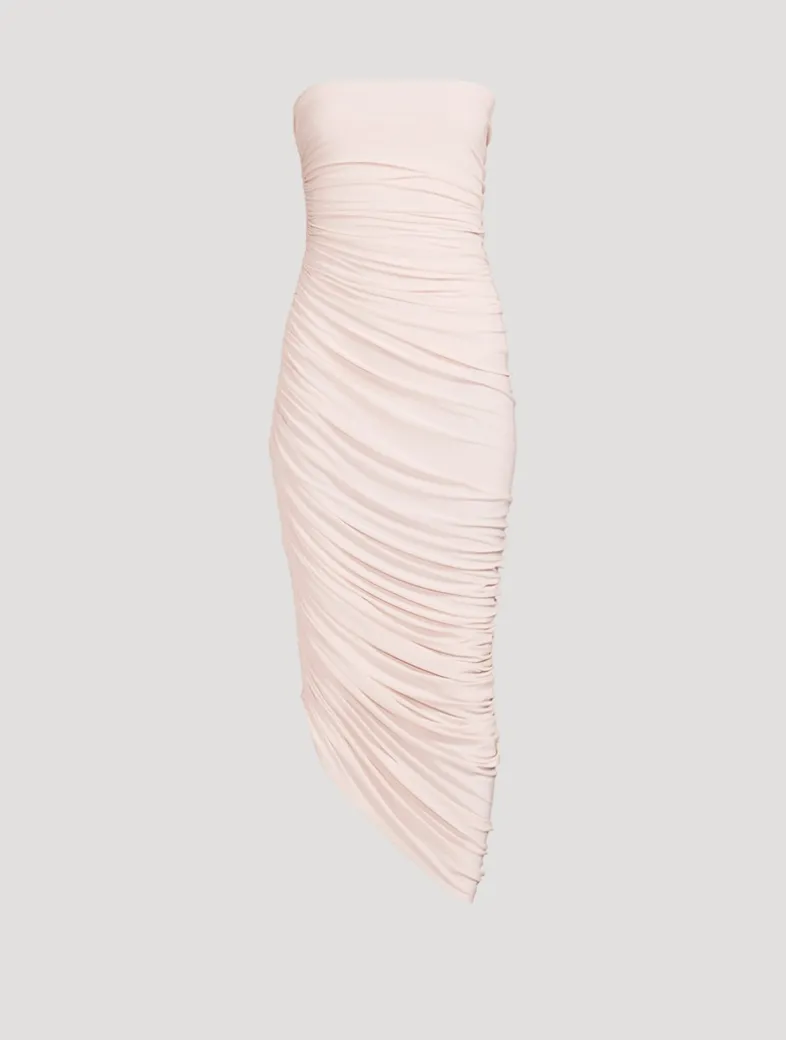 Flaunting shirred sides and soft, allover ruching, this knee-length dress exudes a classic simplicity. It is cut in a curve-hugging silhouette with a strapless neckline and an asymmetric hem. A four-way stretch bodysuit is built in the garment for comfort and to create the drape of this style. For easy fit and more draping, choose one size higher.
