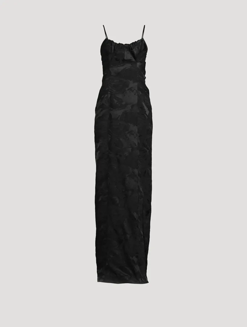 A subtle floral jacquard design lends a romantic touch to this elegant gown. Crafted from satin and cut to a curve-skimming silhouette, it has a gathered scoopneck framed by slinky shoulder straps.
