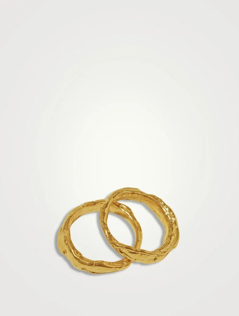 A set of wax-carved rings, designed as a tribute to eternal connectedness. Inspired by museum heirlooms, these rings feature molten surfaces and fractured edges, as if unearthed after years underground. Stack them as a symbol of unity and togetherness. Designed and made in Canada.
