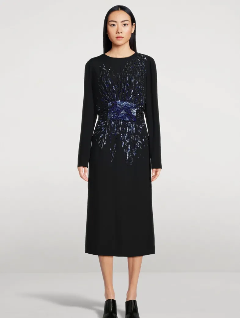 A luxe twist on the wardrobe classic, this long-sleeve dress is embellished with sparkling beaded embroidery across the front. Designed with a nipped-in waist and back vent to keep the look polished and elegant.