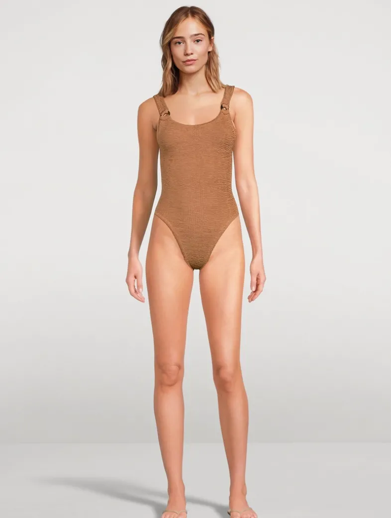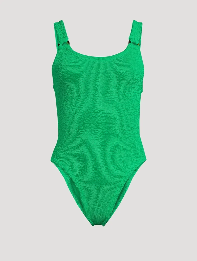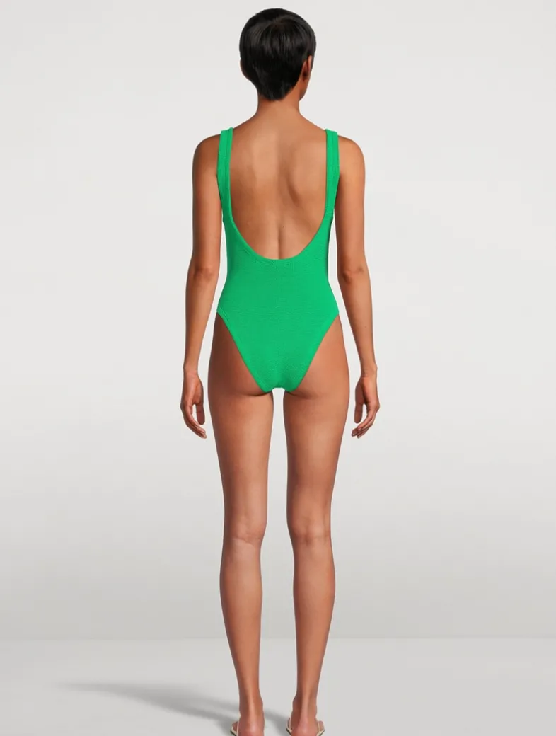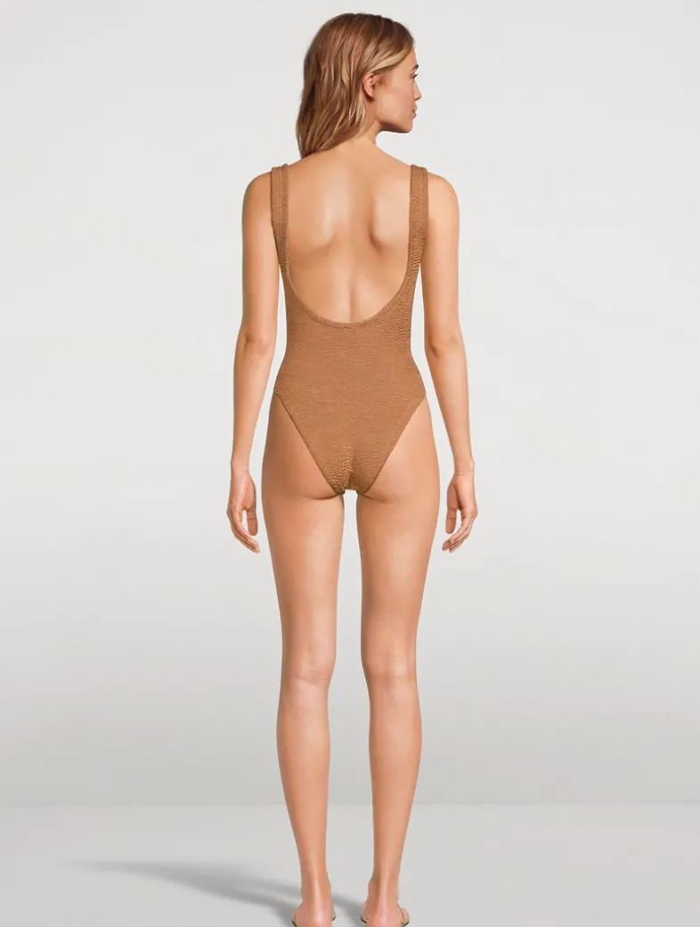 A nod to Hunza G’s roots in the ’80s, this high-cut leggy design features tortoiseshell accents, a dipped-neck silhouette, and low scooped back. Offering light bust support and classic coverage on the bottom, the one-size fit is made possible by the brand’s signature figure-flattering crinkle fabric that flexes to sculpt and support most shapes. Certified to the OEKO-TEX® Standard 100, LEATHER STANDARD, or OEKO-TEX® MADE IN GREEN.