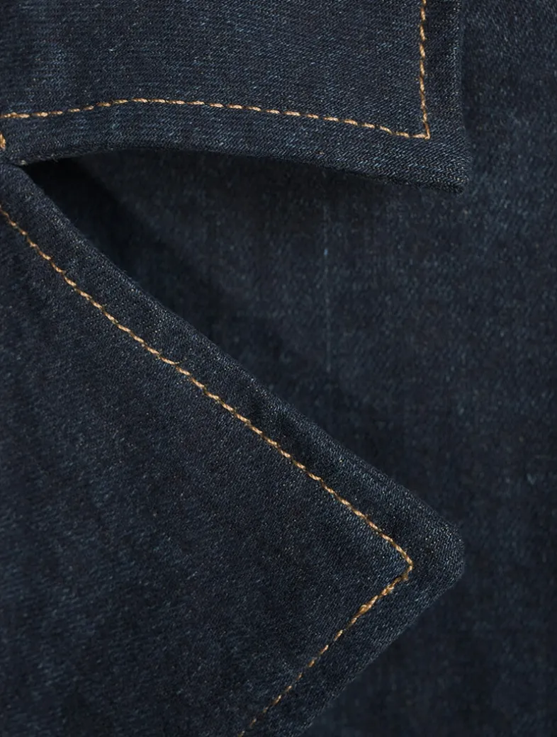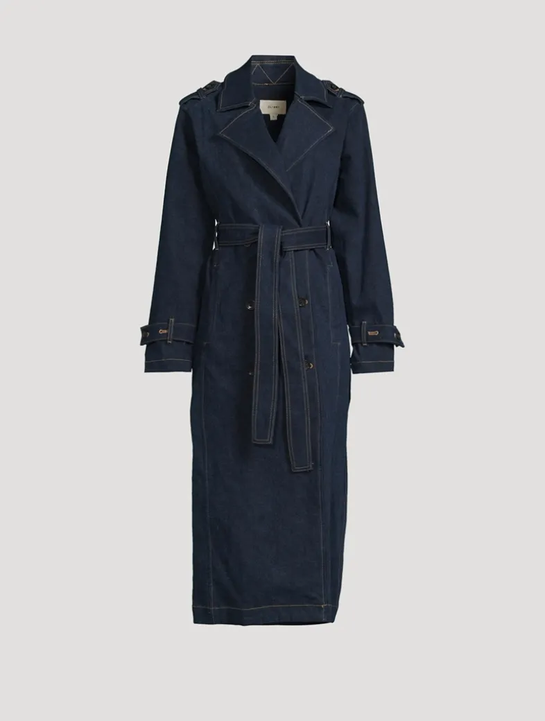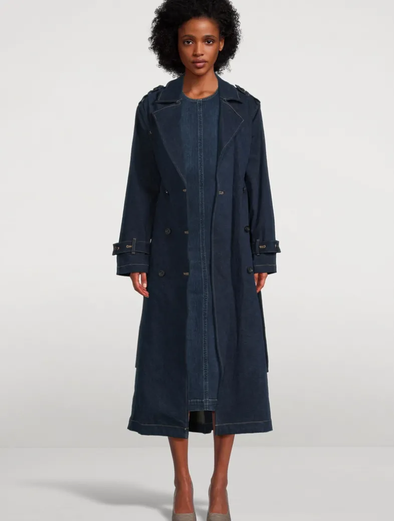 This trench is a classic, belted overcoat that is sure to become a closet staple. Made in stretch denim in a classic, deep indigo wash. It features buttons, a self belt, khaki stitching, and clean finishing.