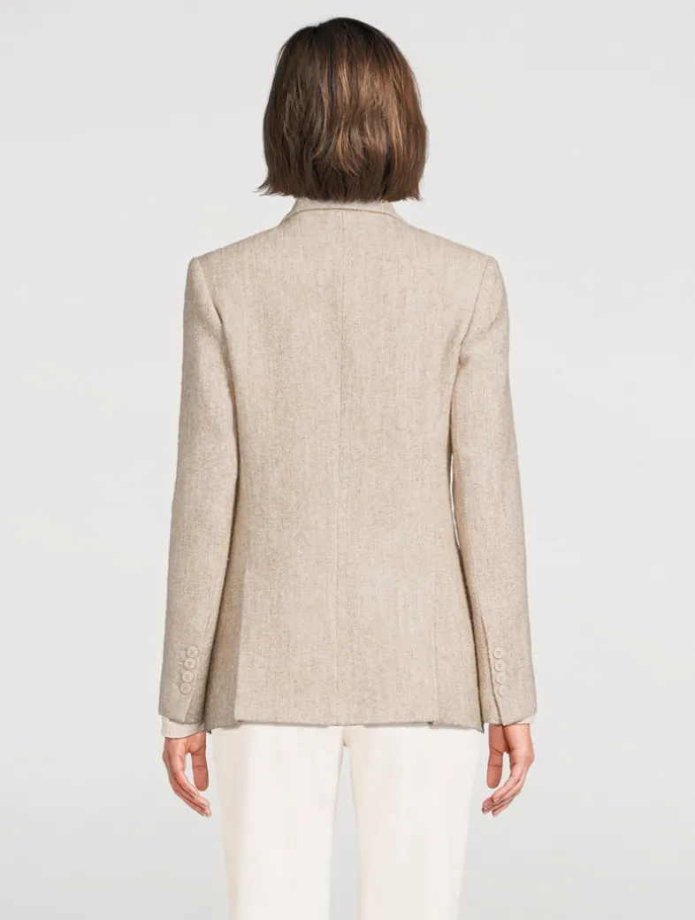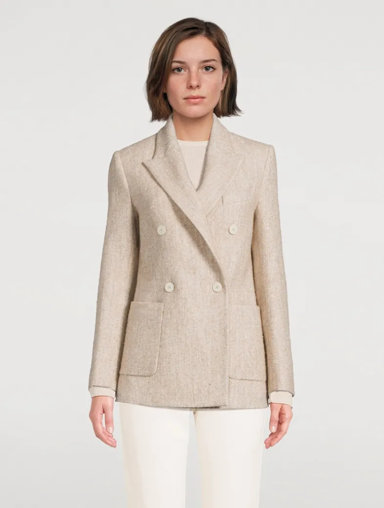 This double-breasted jacket with patch pockets is made from a unique fabric with a knit effect. The special binding of wool and alpaca yarns creates a three-dimensional texture that makes this topper stand out.