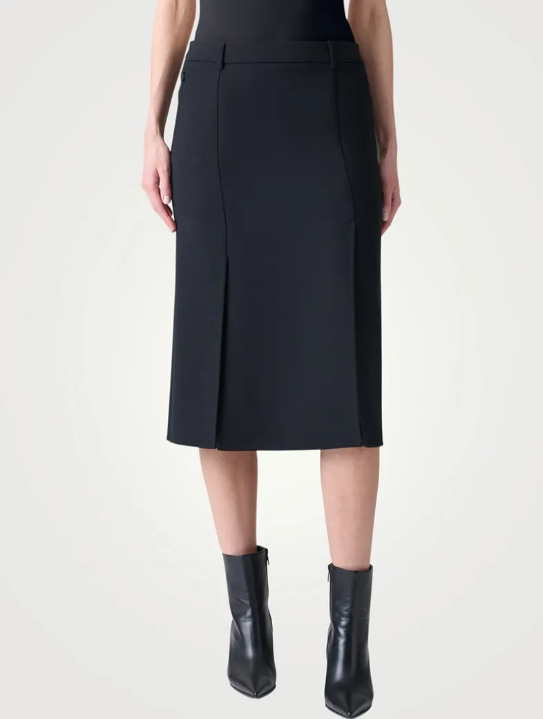 Nodding to menswear-inspired suiting, this double-face midi skirt has a waistband with belt loops, side pockets, and multiple slits at the hem.