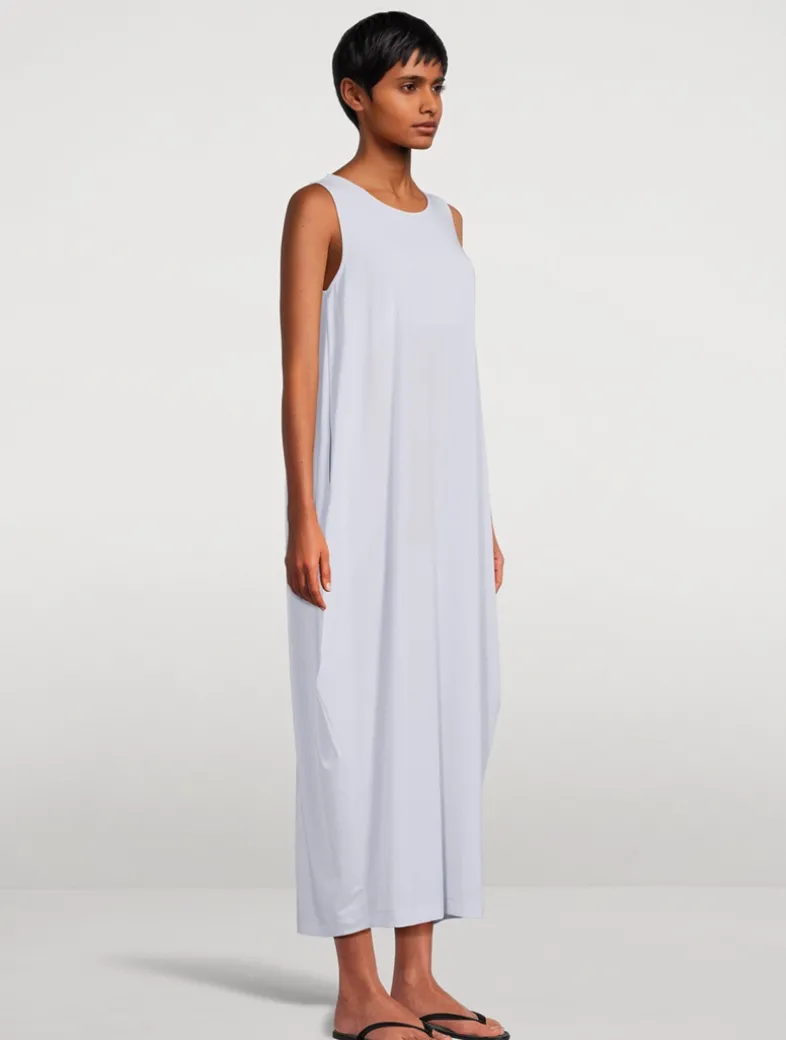 Soft Drape Jersey-56 is a staple series, offered in a neutral colour palette. This sleeveless midi dress has a scoop neckline.