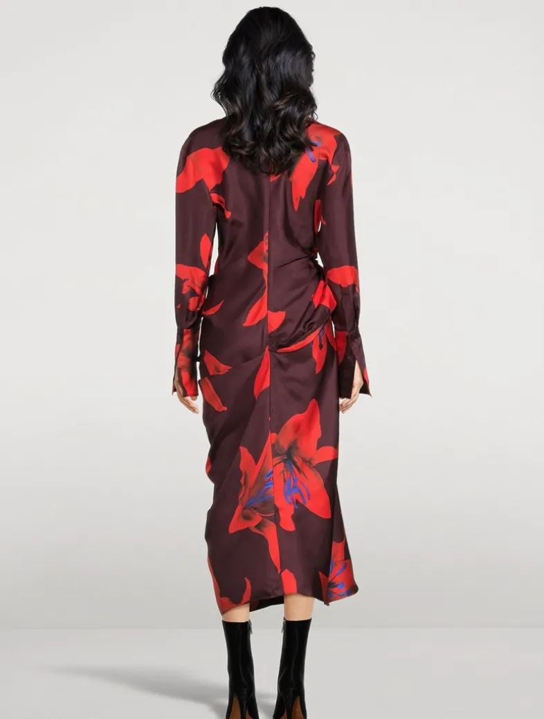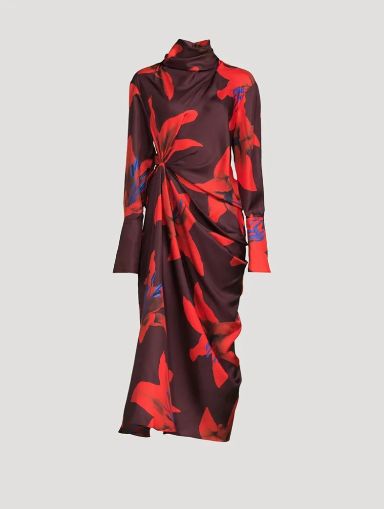 Made in Italy, this midi dress is crafted in silk twill with an all-over Fire Lily print. It has a high cowl neckline, oversized cuffs, and side knot with draped detailing. Finished with a back zip fastening.