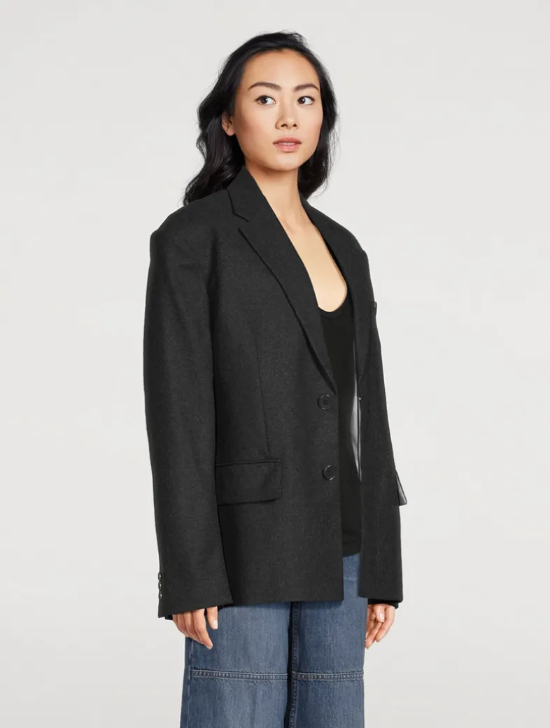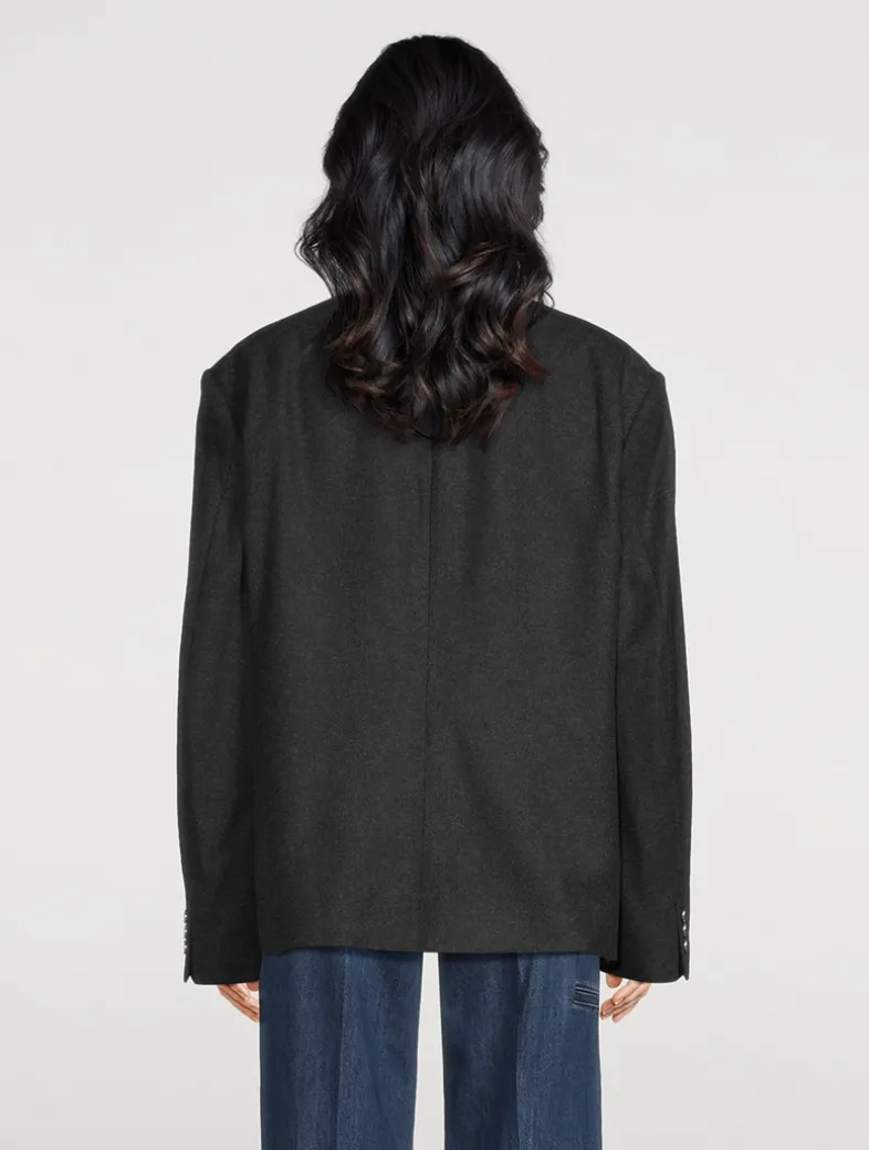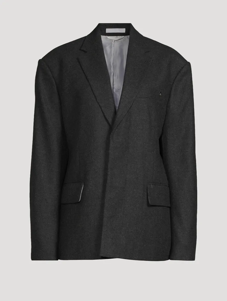 This classic blazer is crafted in a wool-blend flannel melange. It has an oversized single-breasted fit with peak lapels and flap pockets. Wear the jacket like a backpack using the adjustable interior straps, inspired by bomber jackets. This garment was designed with a unisex fit so you can express your unique style.
