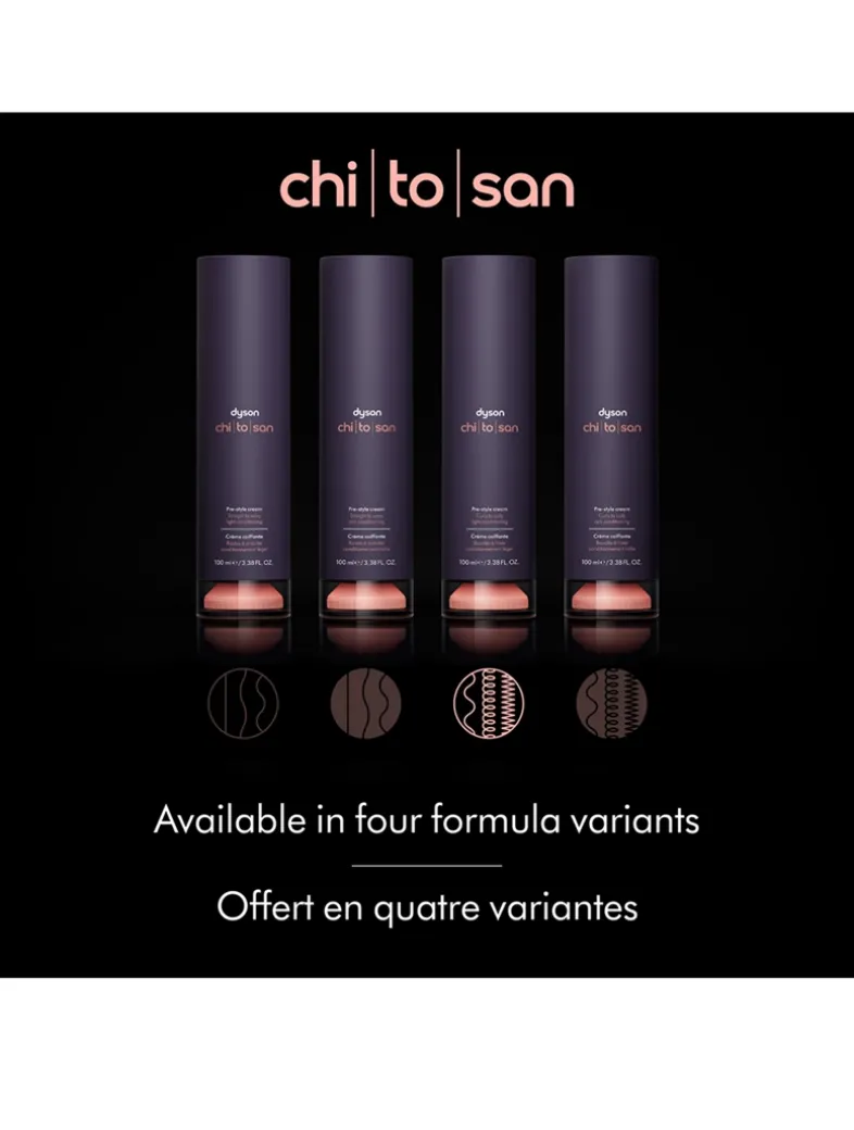 - Dyson Chitosan™ Pre-style cream Curly to Coily, Light Conditioning is developed for hair that naturally forms spiral curls and ringlets, tighter corkscrew or S-curls, or closely coiled Z-patterns. Best suited to thinner hair strands that are easily weighed down.
