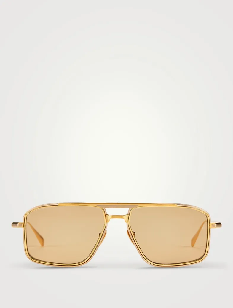 Inspired by the 1970’s, these sleek navigator sunglasses are detailed with titanium lens-rim inserts and dual-tone brow and temple details with signature Art Deco embellishments.