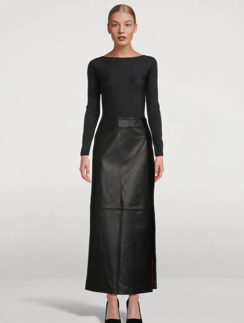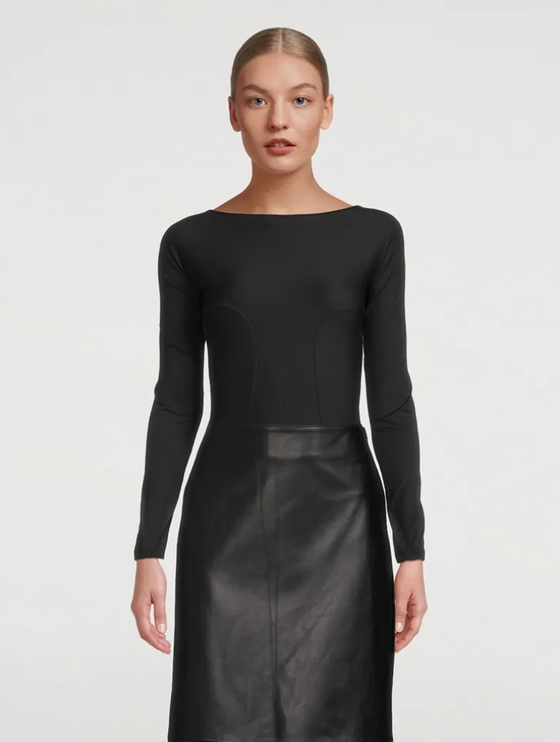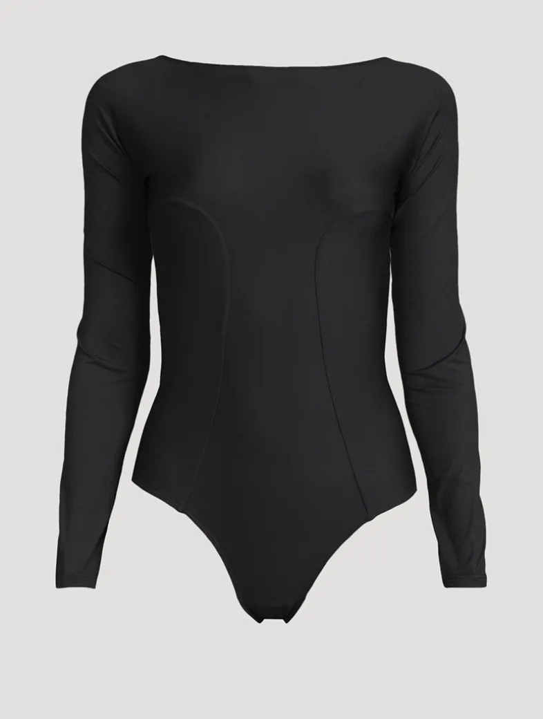 The Echauffe Backless Bodysuit features a striking low scoop back with a keyhole detail at the base of the spine. Sculpting lines accentuate your curves, drawing attention to the waist and elongating the figure. Perfect for layering or wearing alone, this piece makes a daring statement.