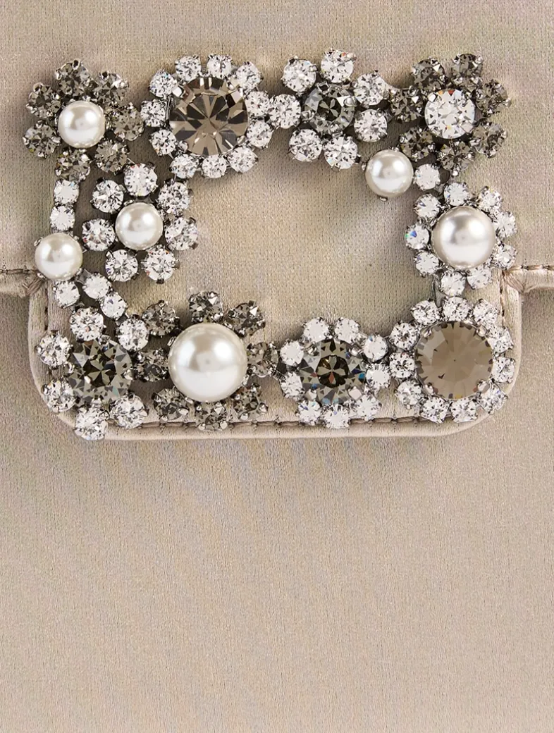 The Efflorescence buckle is characterized by shiny flowers made of crystals. This jewel with Rococo essence adorns this clutch in silk-blend satin. Featuring a metal chain strap, this practical bag is designed to complement an evening outfit.