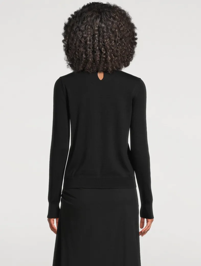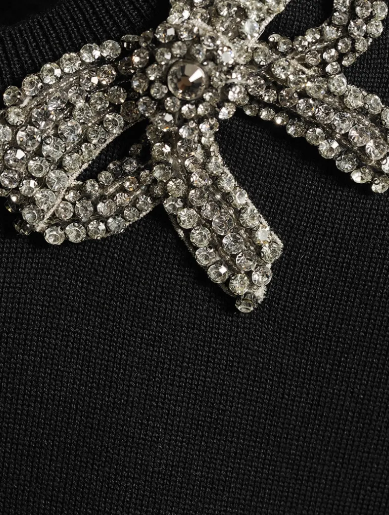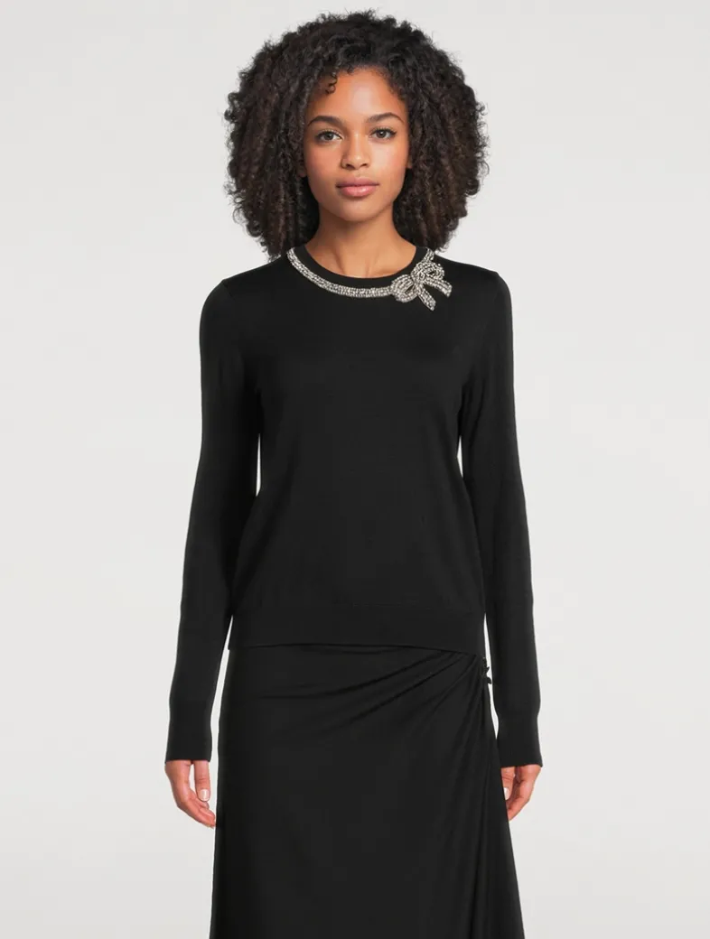 Knit from a signature blend of silk and cotton, this lightweight sweater is embroidered with sparkling crystals in the shape of an oversized bow.