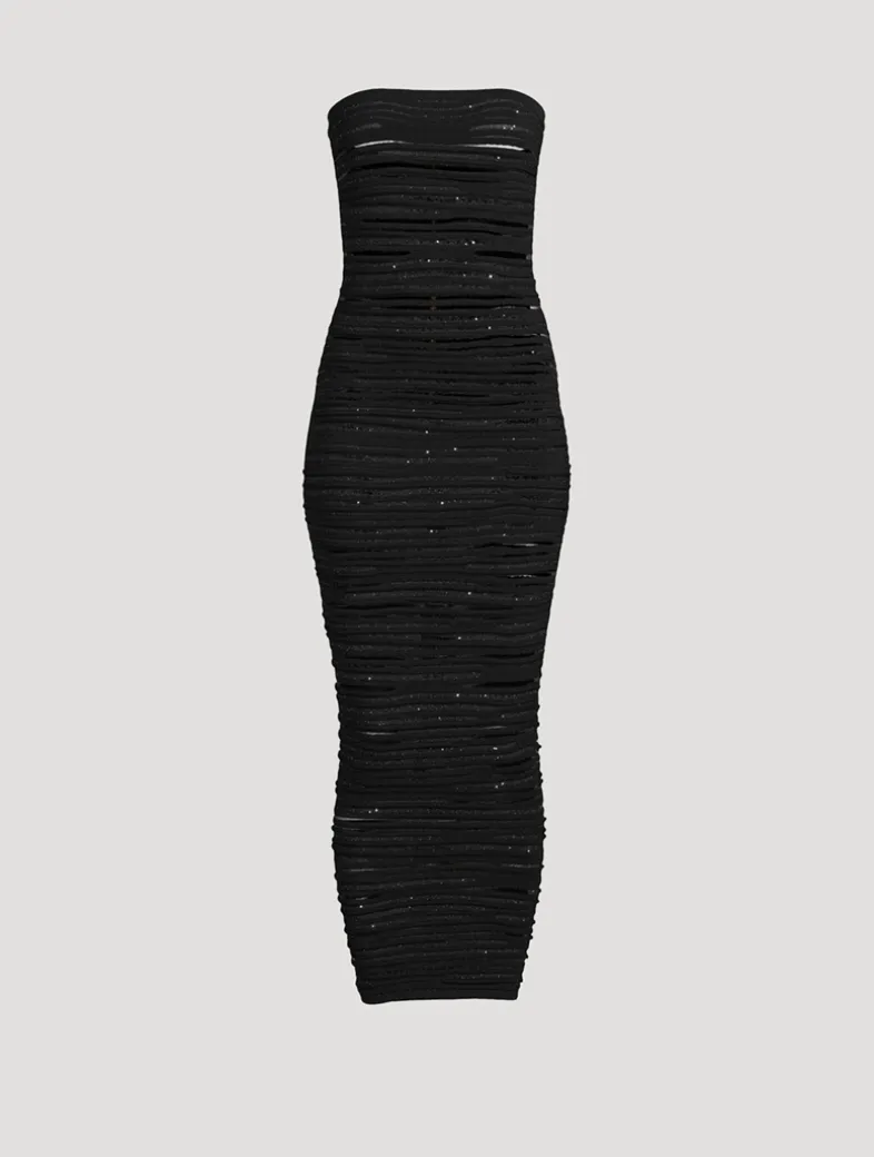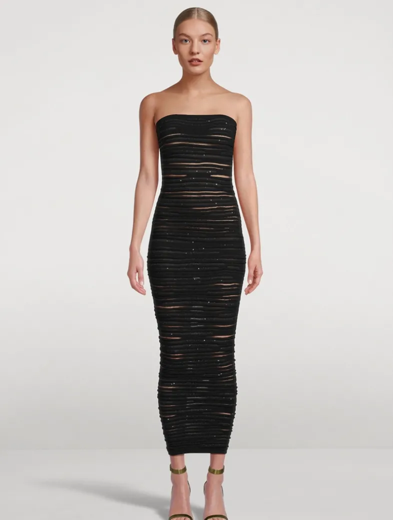 Made in France, this elegant gown has a shimmering rolled knit construction mixed with sheer inserts. A silicone strip around the inside of the bodice ensures the strapless dress stays in place. Finished with a visible gold-tone metal zip fastening on the back with a Balmain Paris-engraved slider. 100% of the viscose fibres used to make this garment come from certified, sustainably managed forests.