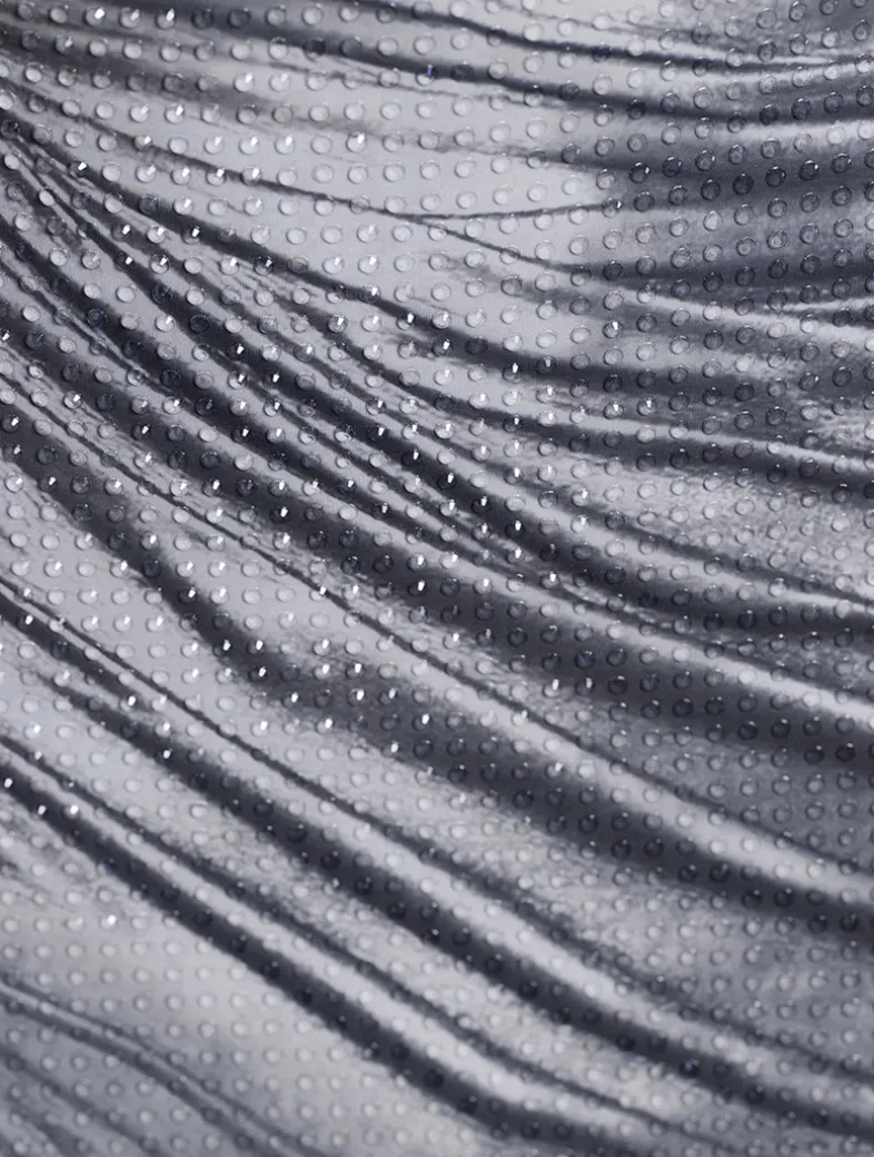 A trompe l’œil design with a faux wet look and asymmetric ruching lends a modern touch to this sleeveless dress. Crafted with a hint of stretch, the jersey mini is embellished with delicate crystal beading all over. Finished with an exposed zip at the back.