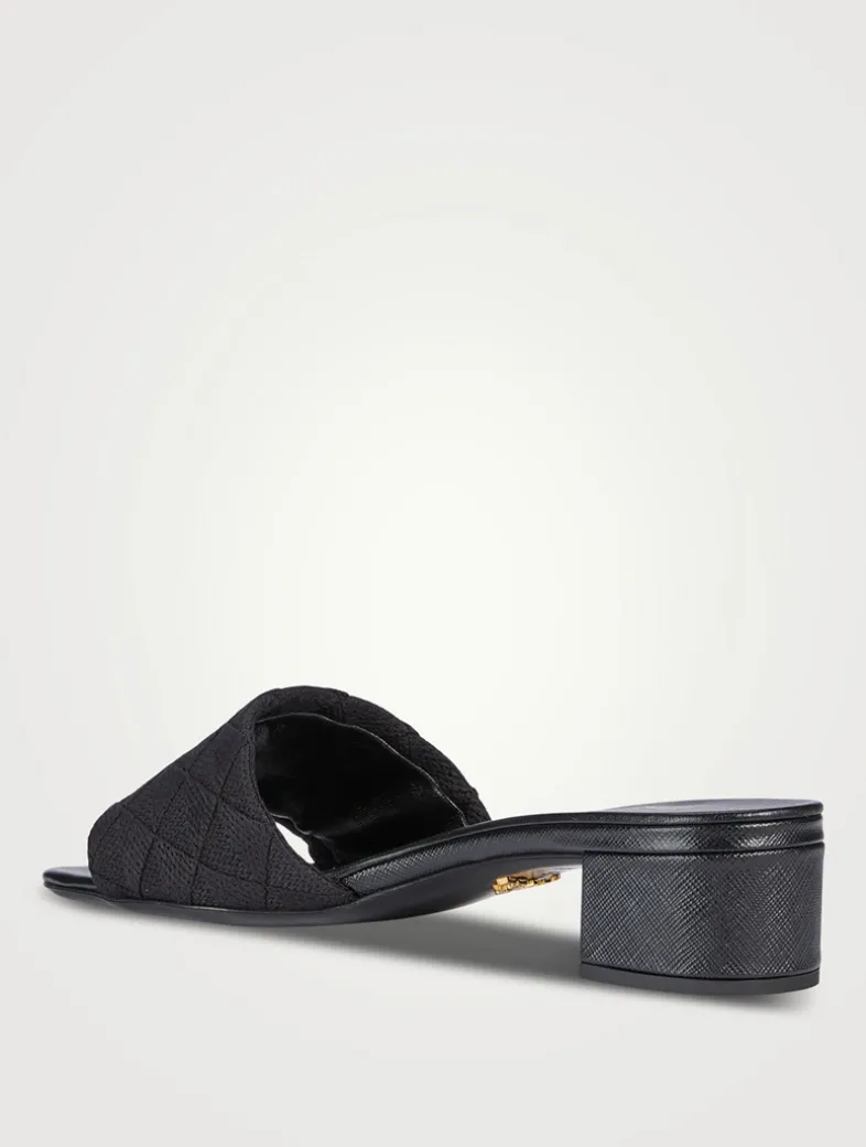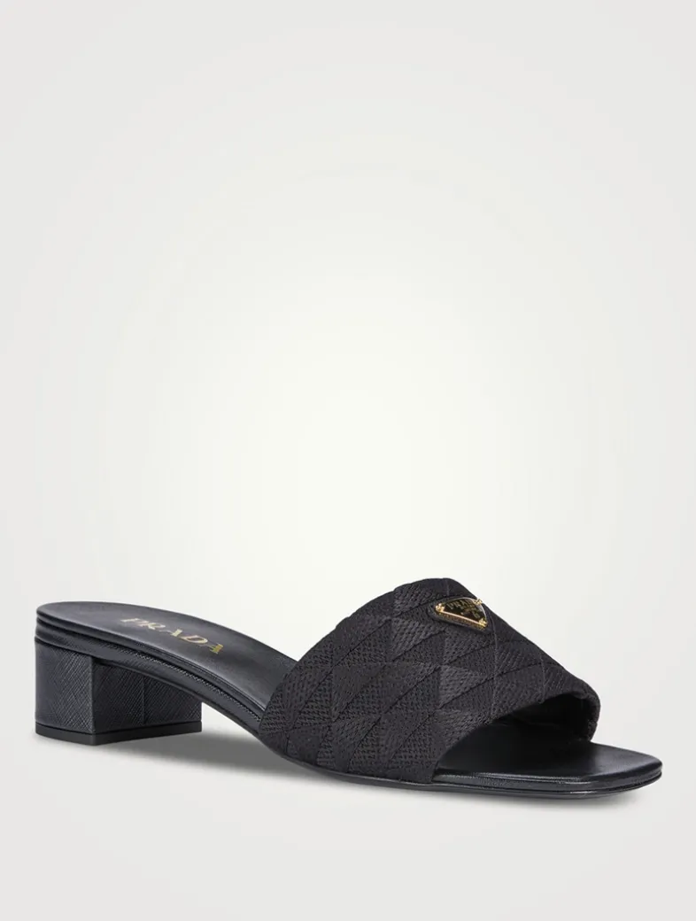 A subtle take on the graphic prints that has always characterized Prada collections is reflected in these mules, a sleek design enhanced by a new interpretation of the iconic triangle as a graphic pattern. The enamelled metal triangle logo in its most classic version decorates the band.