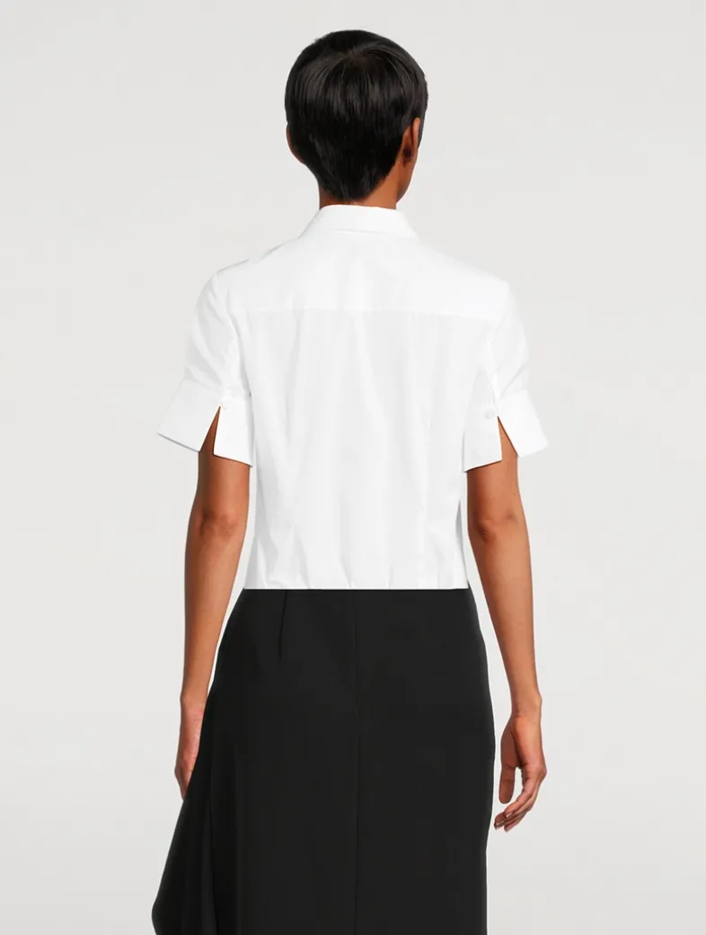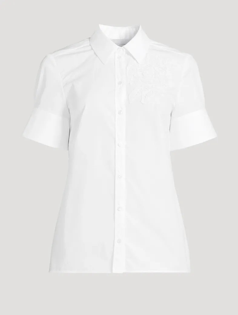 Cut from crisp cotton, this fitted shirt has short sleeves with flared cuffs and an embroidered flower patch at the chest.