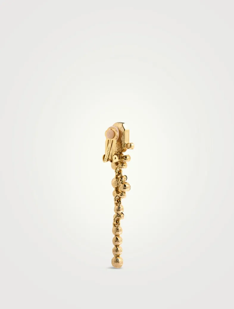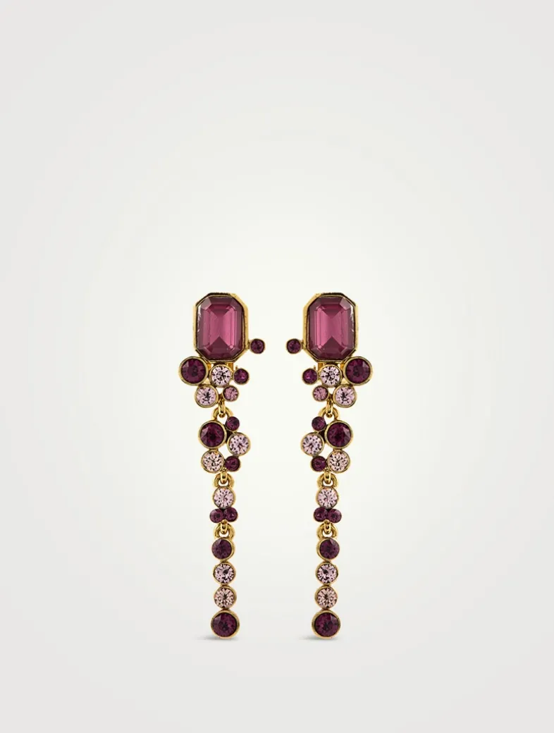 These striking earrings feature an artful drop of delicate round-cut glass crystals suspended from a bold, emerald-cut glass crystal.