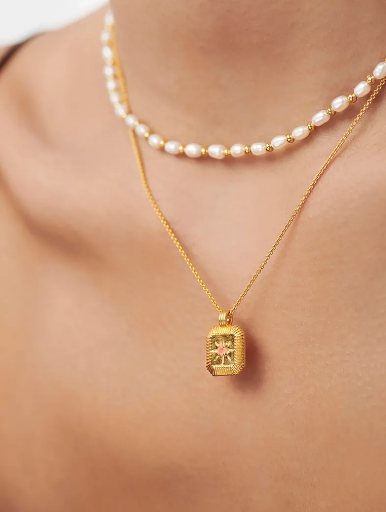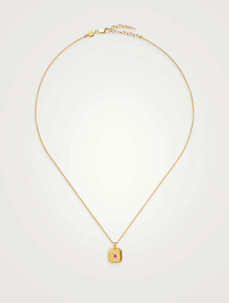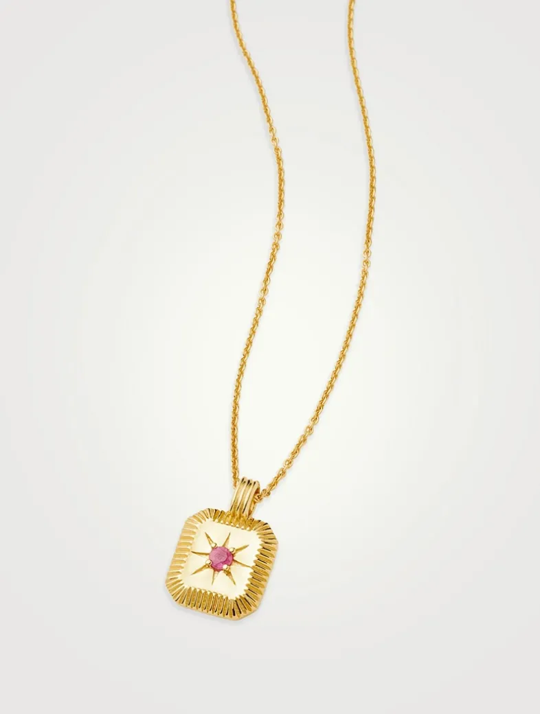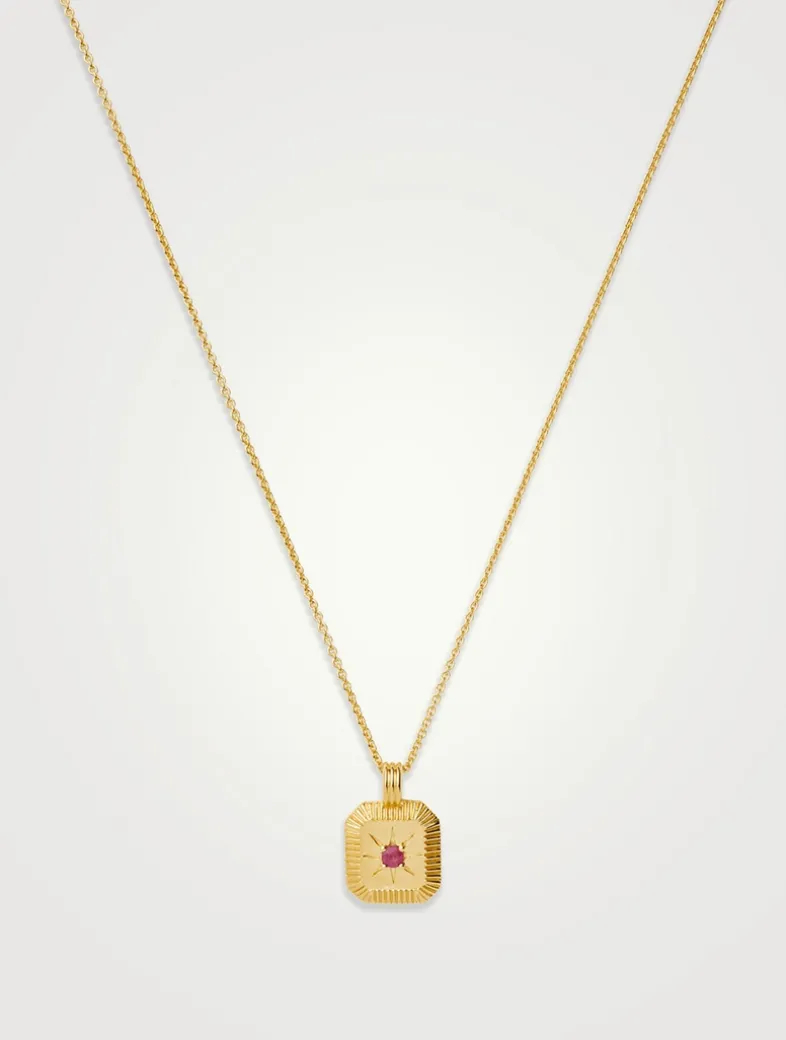 Bring your birth month a whole new meaning with a personalized gemstone necklace. The ridged pendant, held on a short chain necklace, holds a natural ruby gemstone, symbolizing protection and prosperity, and is embellished with a central star motif. The perfect gift for anyone born in July.