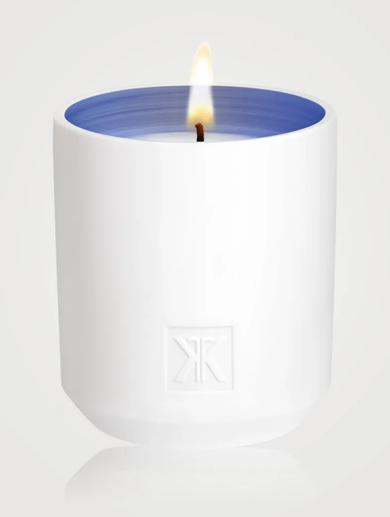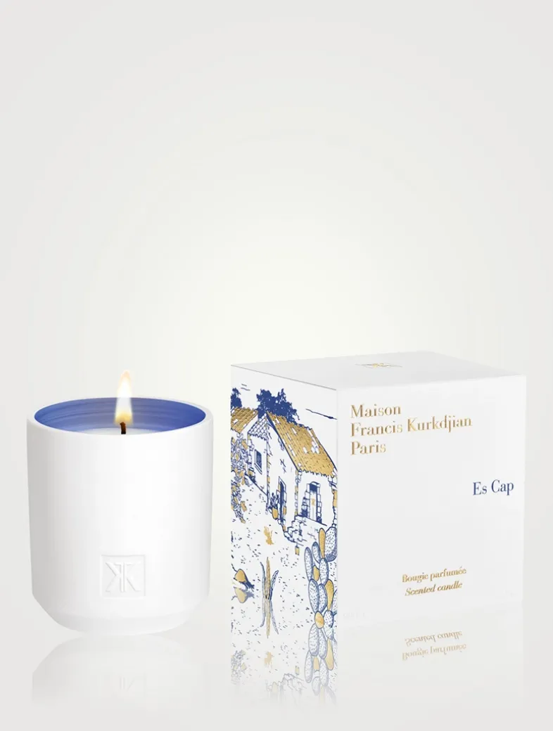 The Es Cap Maison Francis Kurkdjian scented candle is presented in a porcelain jar from Limoges where the inside color is applied by hand. The French plant and animal wax holds a braided cotton wick to preserve the candle’s olfactory quality and ensure an optimal 55-hour burn time.