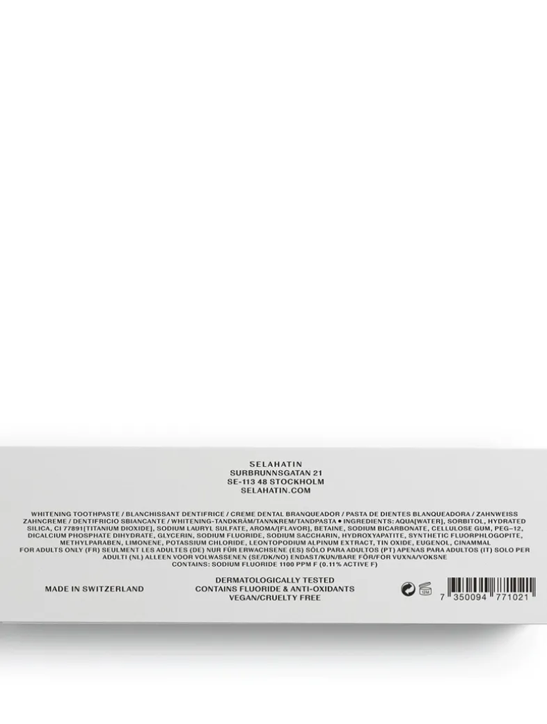 This whitening toothpaste gently fuses cinnamon, orange, and peppermint together. The formulation is developed and produced in Switzerland, contains fluoride, four whitening agents as well as anti-oxidants. Betain relieves dry mouth while edelweiss extract restores and heals gums.