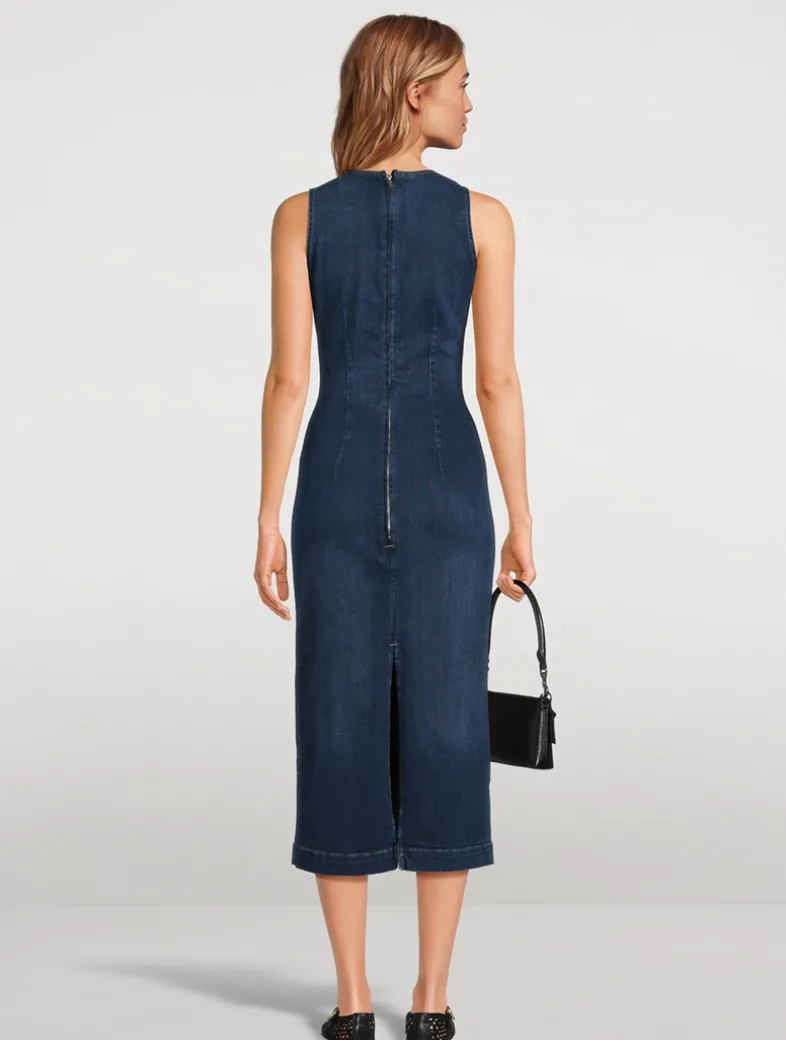 Esme is a form-fitting, sleeveless midi dress closed with a zipper at the back. Crafted from denim with a hint of stretch.