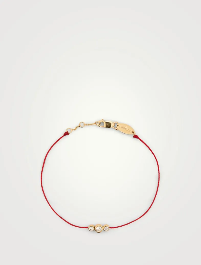 From the Eternity Amuro collection. This 18k gold bracelet unites a 0.10 carat diamond and two 0.05 carat diamonds soldered together. The bracelet is finished with a lucky REDLINE string, gold clasp and three linked rings to make it adjustable.