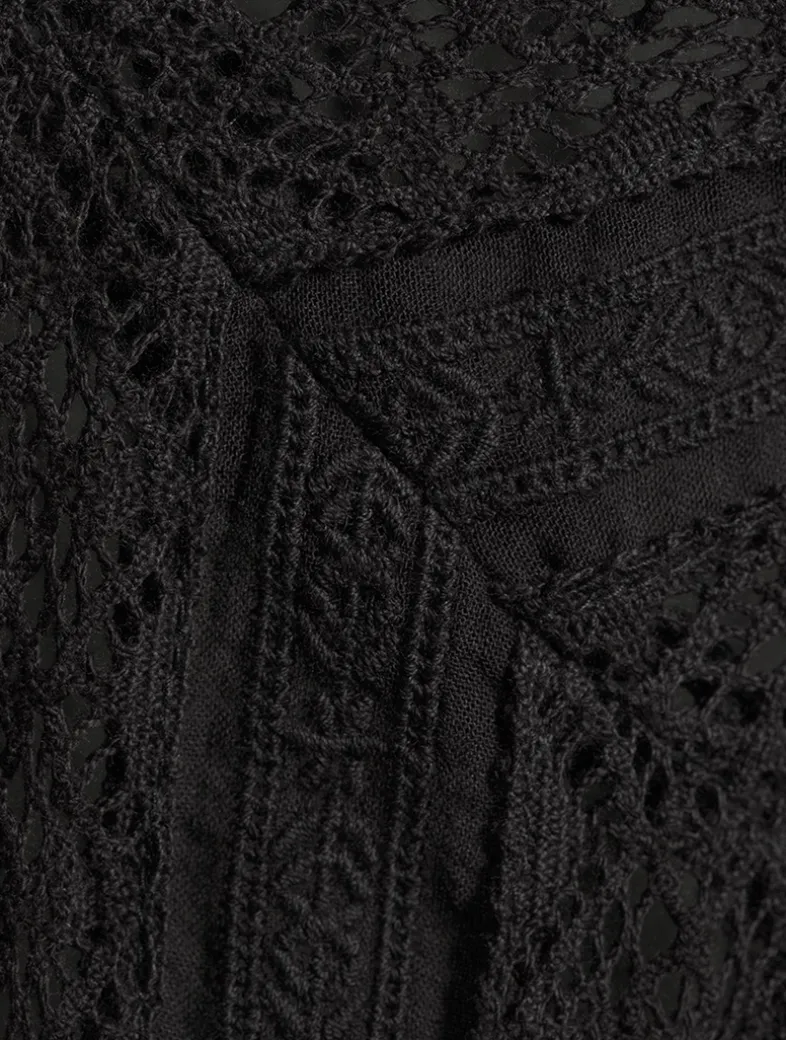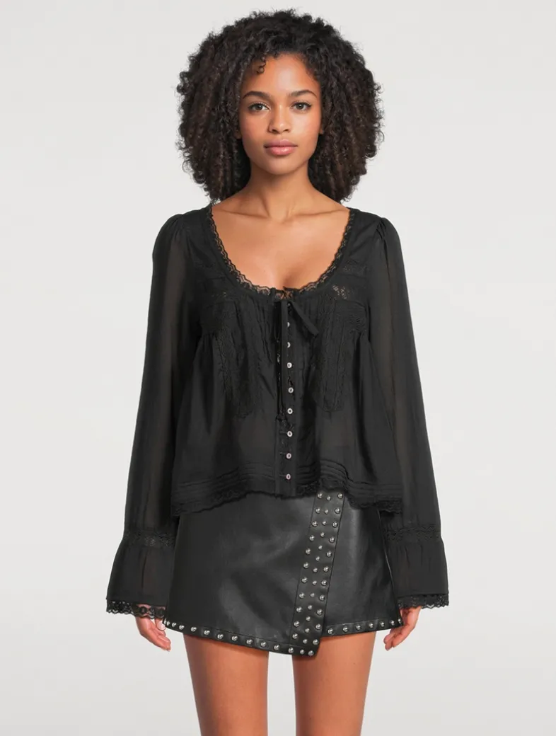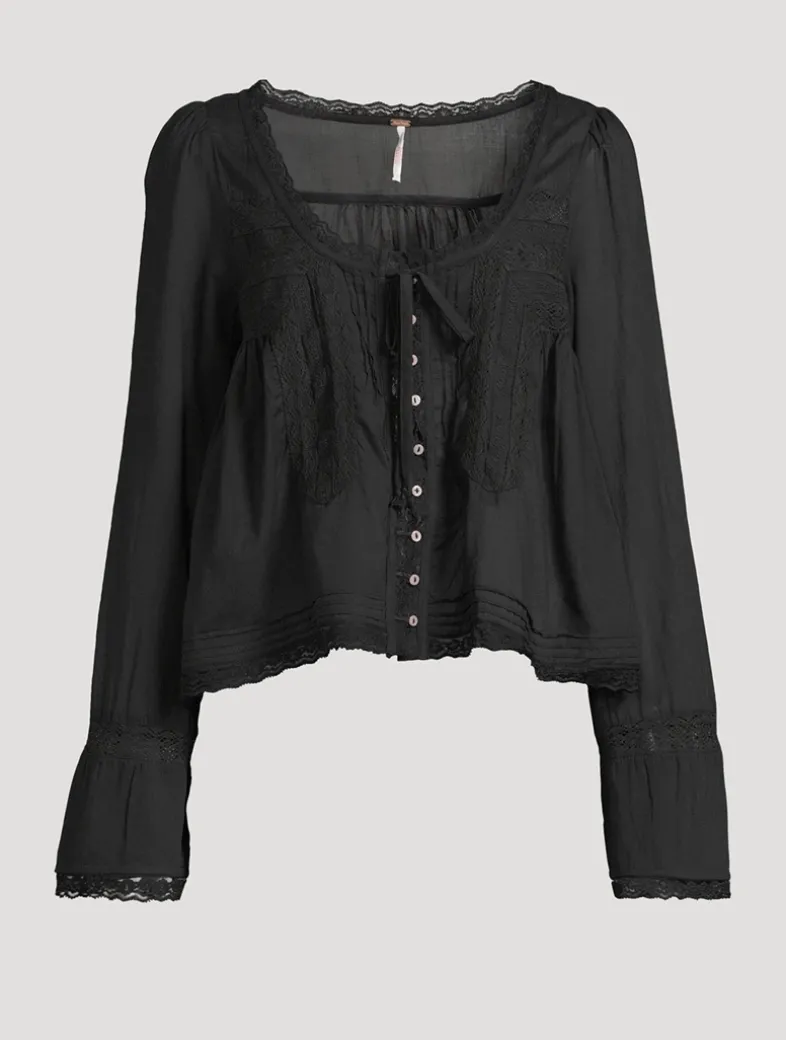 Crafted from a lightweight cotton, this long-sleeve blouse is trimmed with delicate lace and finished with a bow at its scooped neckline.