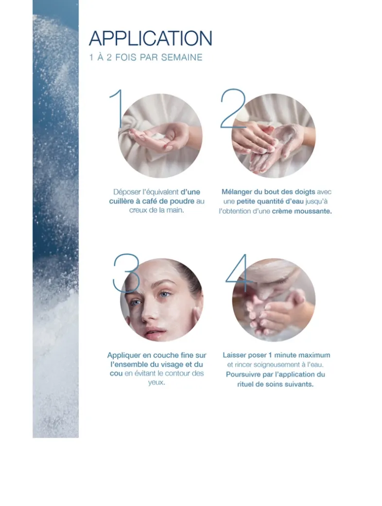 - How to Apply Mask: Dispense 1 gram of powder (about the size of a blueberry) in the palm of the hand and mix with the fingertips while adding a small amount of water until a foaming cream is formed. (Approximately a 1 part Powder to 2 parts Water proportion.)