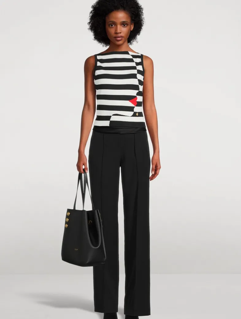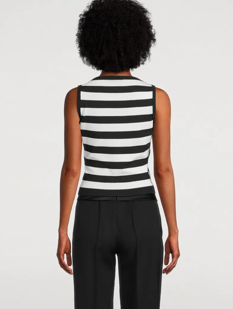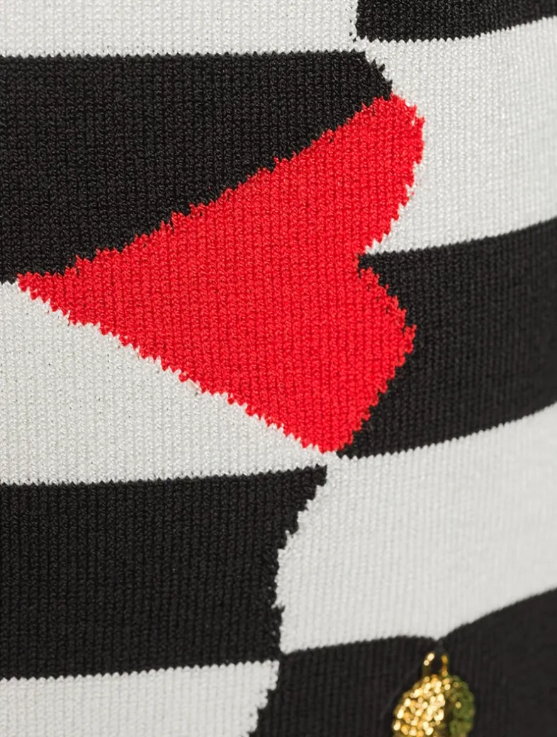 Blending a Parisian-inspired charm with nautical details, this sleeveless sweater has a striped design with a face profile at the front. It has a bateau neckline and a single