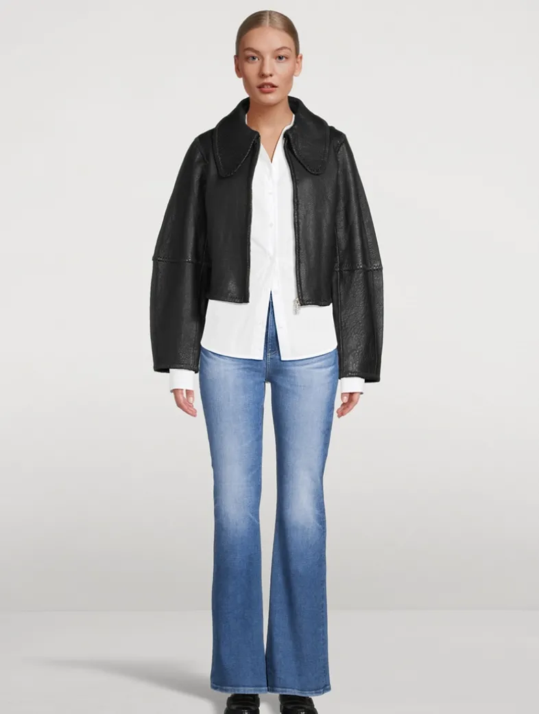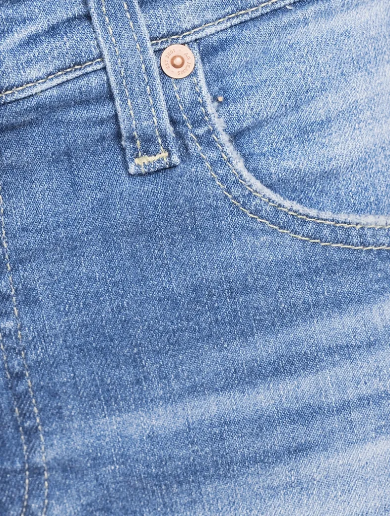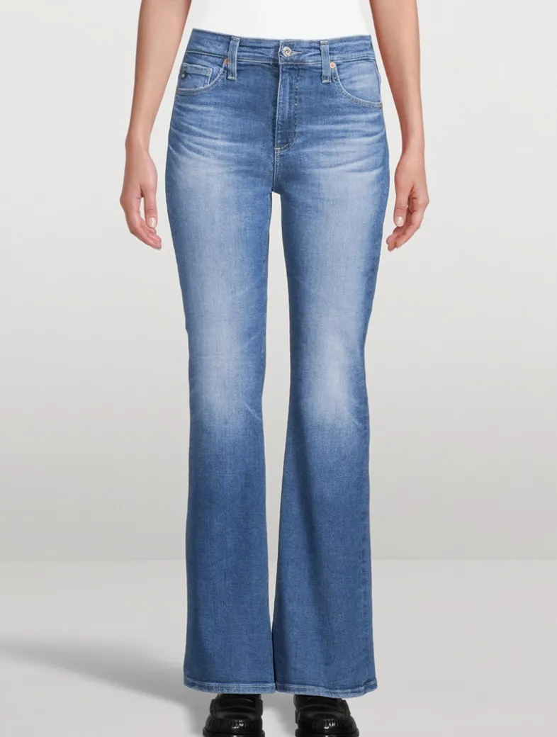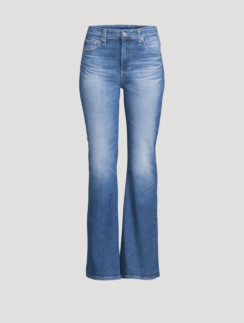 The Farrah is a mid-rise bootcut jean in a medium wash with faded details and worn edges. The pair sits at the natural waist and has a skinny fit through the legs before opening into slightly flared hems. They are crafted from 11.25 oz. Quartzblue Stretch Denim for a flattering shape.