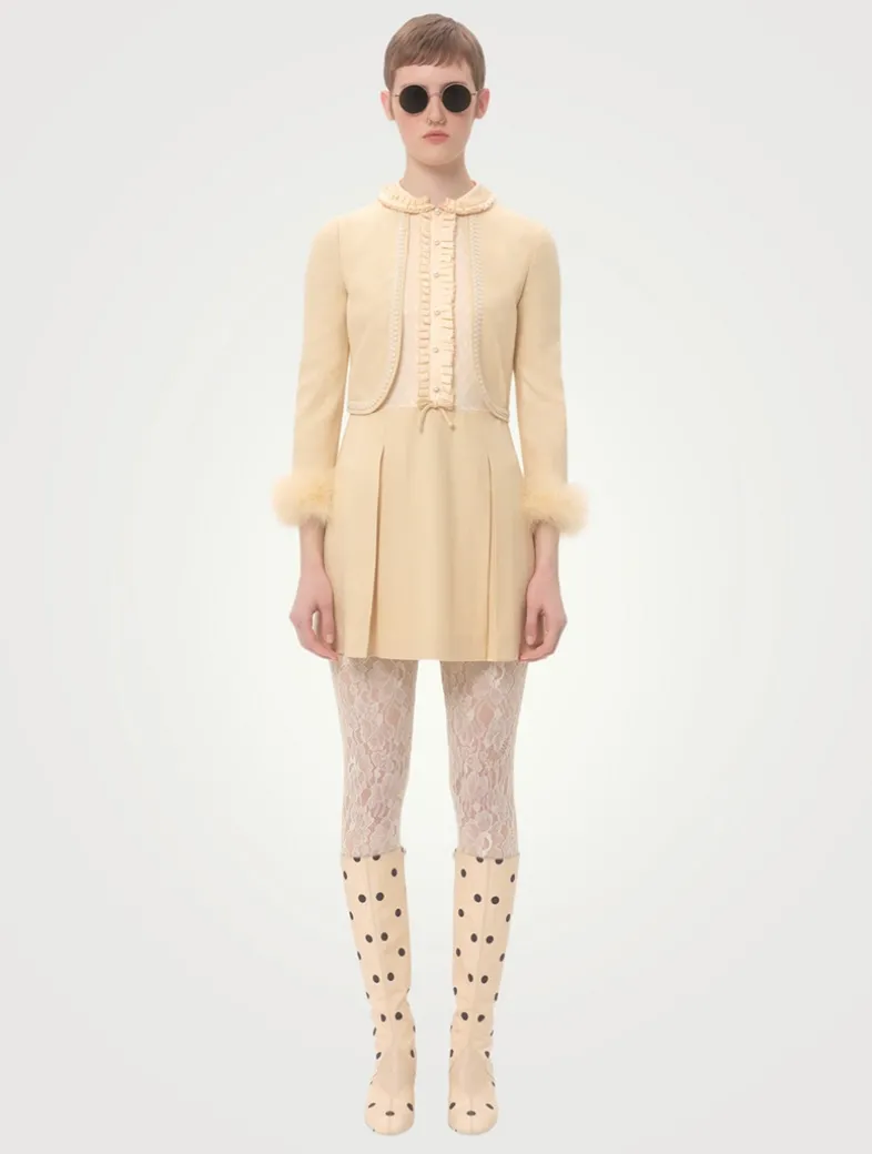This short dress is designed with Toute la V Silk Jacquard inserts on the bodice and feather trim at the cuffs. It has the look of separates with a tailored jacket paired with a pleated skirt.