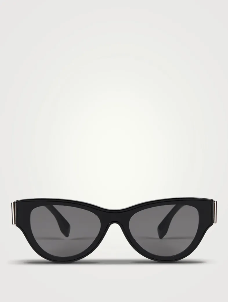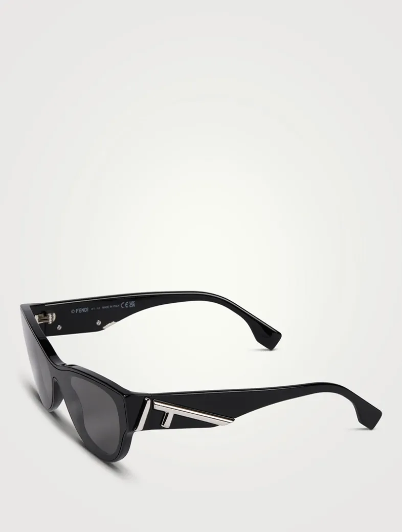 Part of the brand’s Fendi First collection, this acetate cat eye style has a wrap-around lens construction detailed with a metal diagonal oversized F motif on the temples.