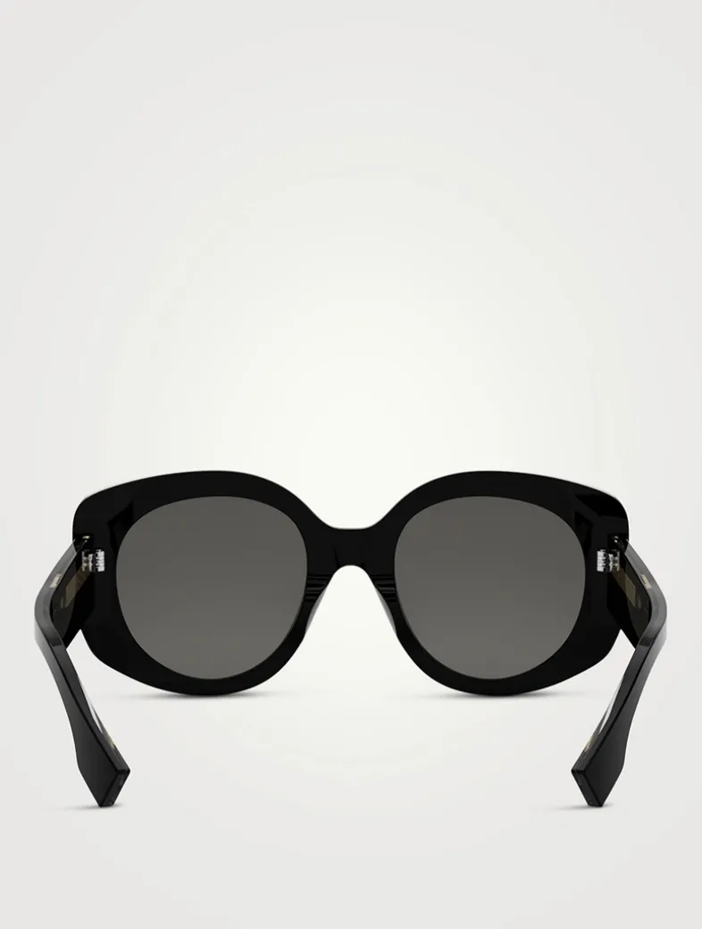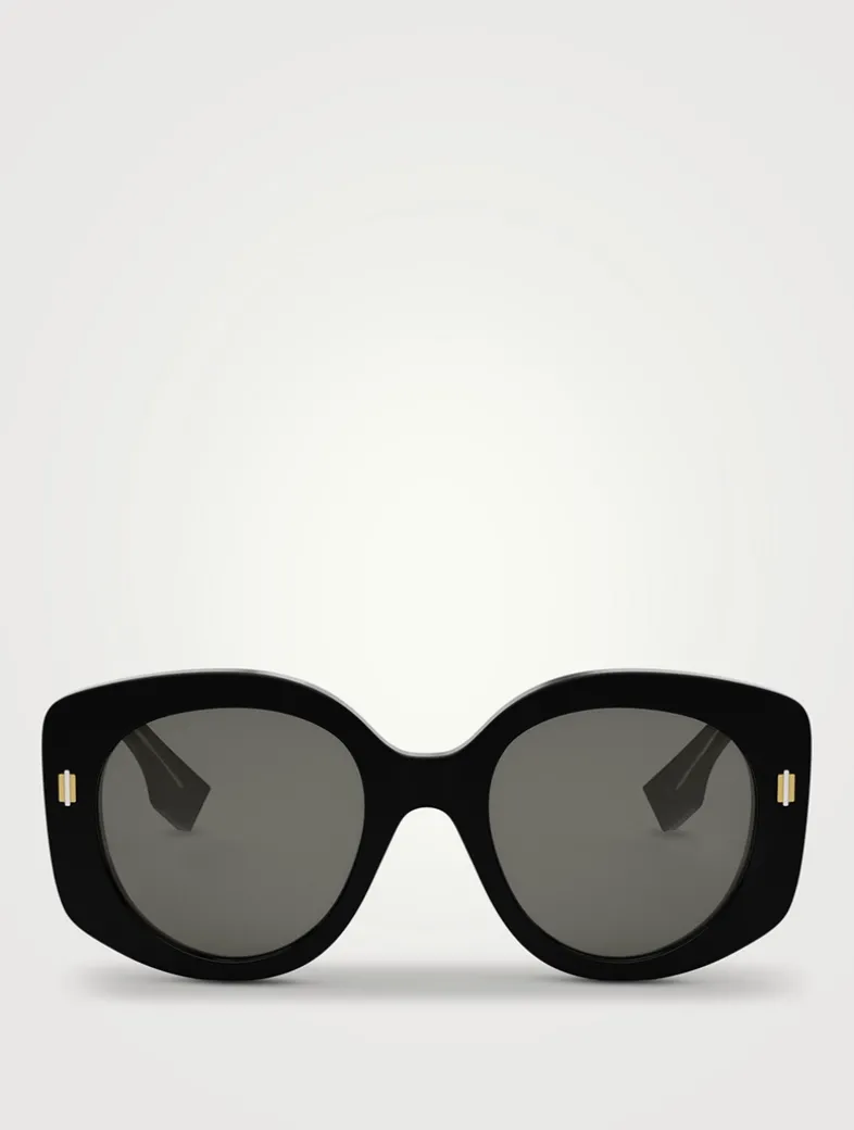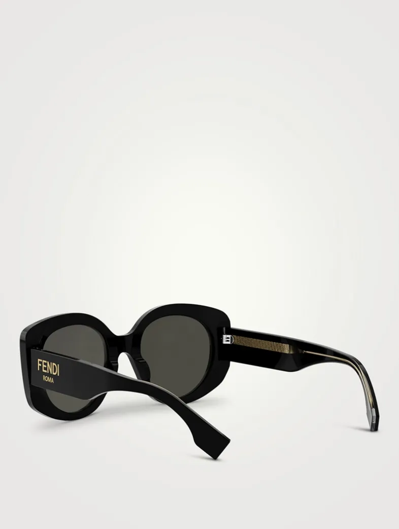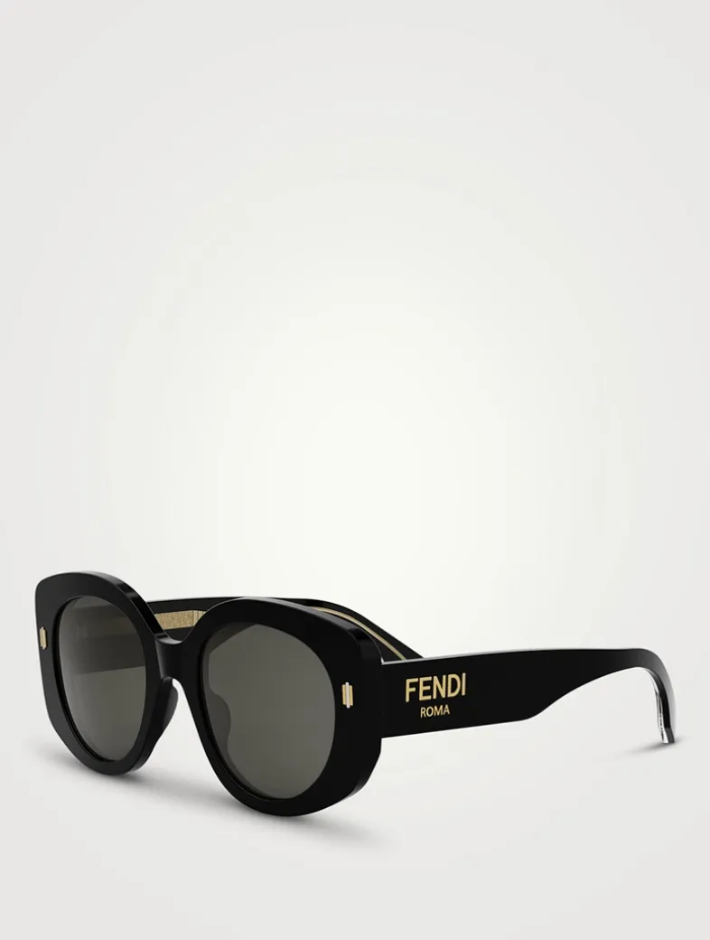 Part of the brand’s Fendi Roma collection, these oversized round glasses are crafted in acetate. The temples have a visible metal core with laser-etched FF motif and gold-finish Fendi Roma logo on the sides.