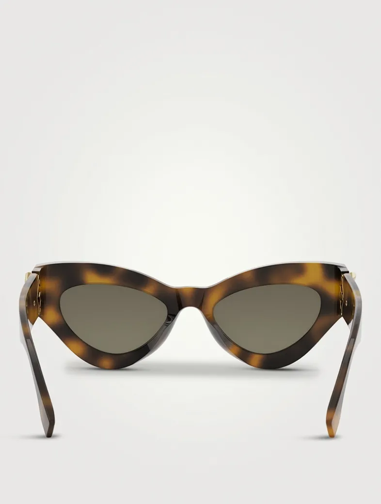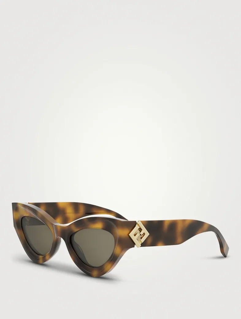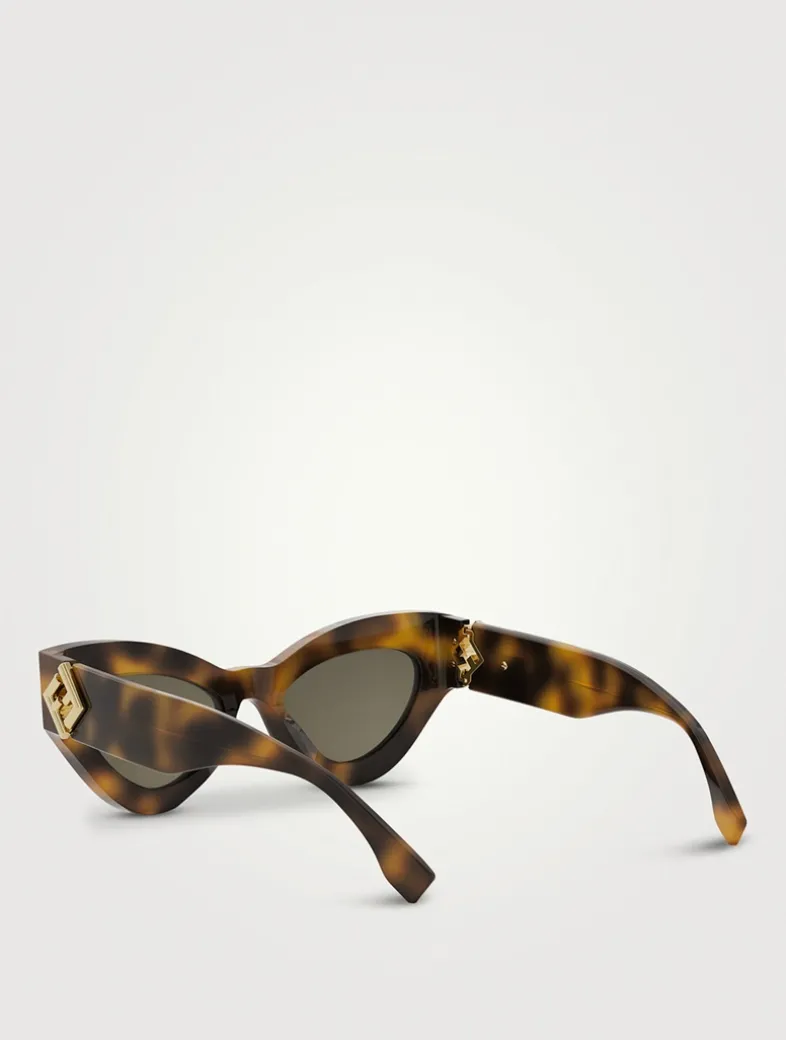 FF Diamonds gets inspiration from the FF Diamonds logo present on leathergoods. Featuring a bold oversized cat eye shape with thick temples, the chunky front is further enriched with a bevelled line surrounding the lenses.