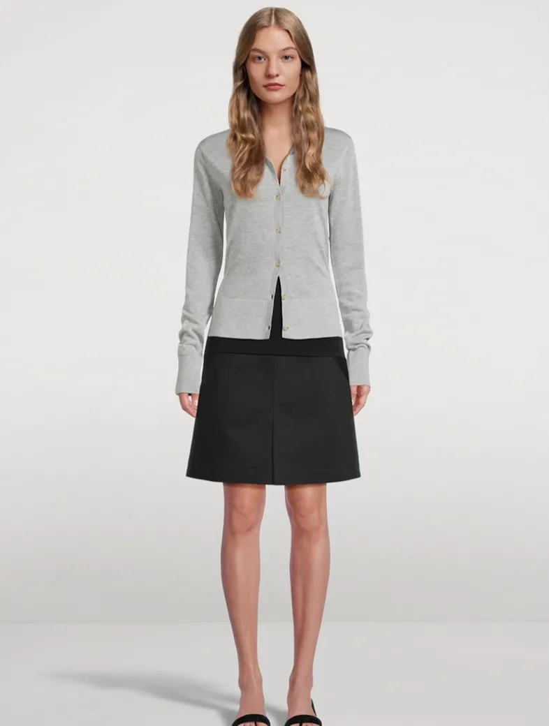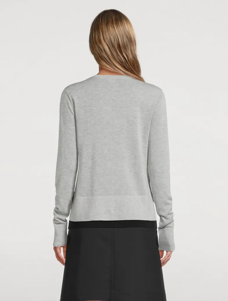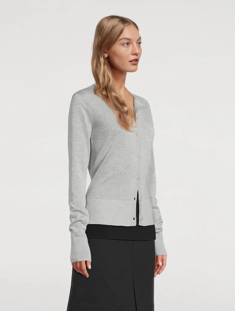 This crewneck cardigan, presented here in a subtle mélange pattern, is finely knit from Lyocell and cashmere fibers to be light yet warm. It features a buttoned front and tonal monogram embroidery, while discreet side slits drape effortlessly over the hips.