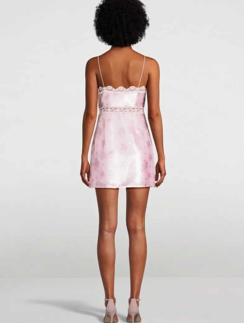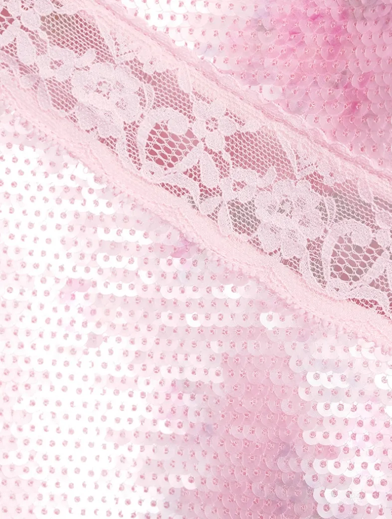 This flirty mini steals the show with large iridescent sequin paillettes all over. The slip dress features delicate spaghetti straps and intricate, contrasting lace at the neck and waistline.