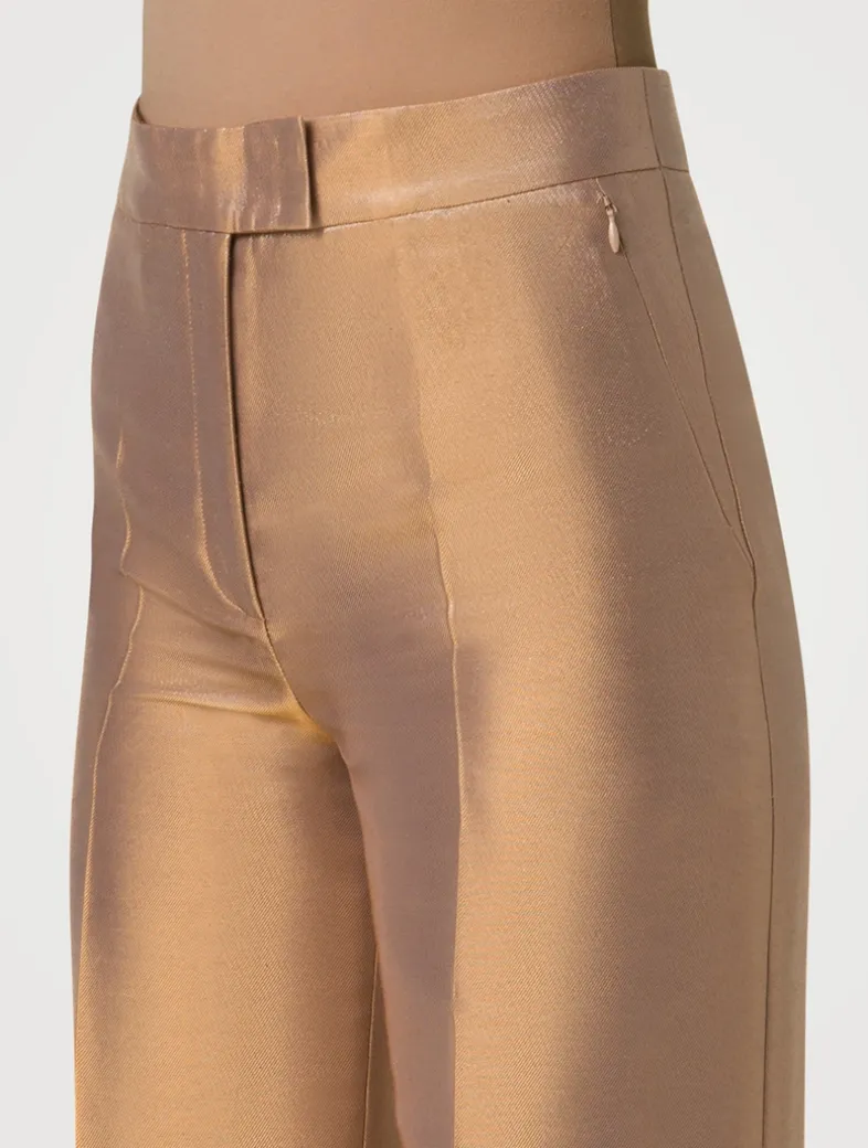 Crafted from a luxurious silk blend in a metallic satin finish, these high-waisted pants are designed with a straight, wide-leg silhouette that flatters from front to back. Complete with side pockets and a concealed front closure, the pair boasts a gleaming metallic finish that elevates the piece.