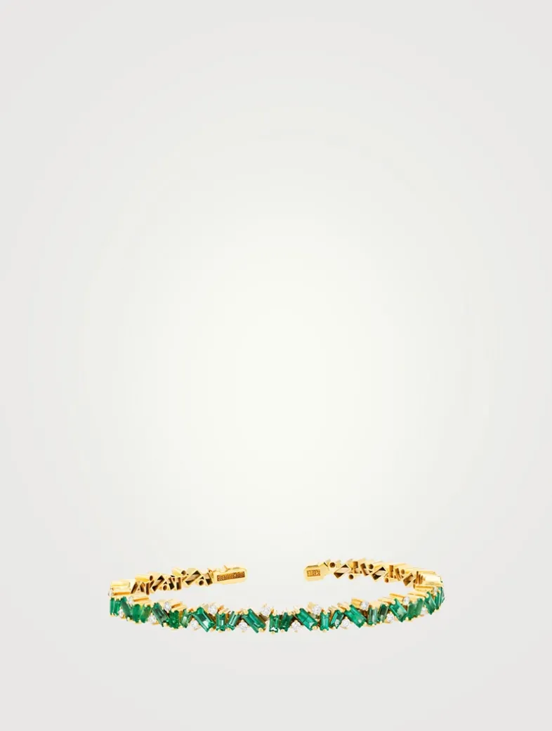 This flexible cuff bracelet is set with baguette-cut emerald and round diamonds on the signature SUZANNE KALAN fireworks setting.