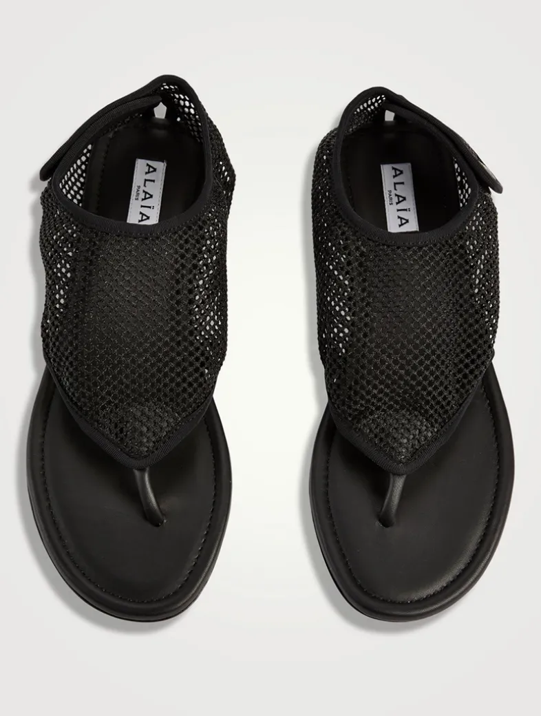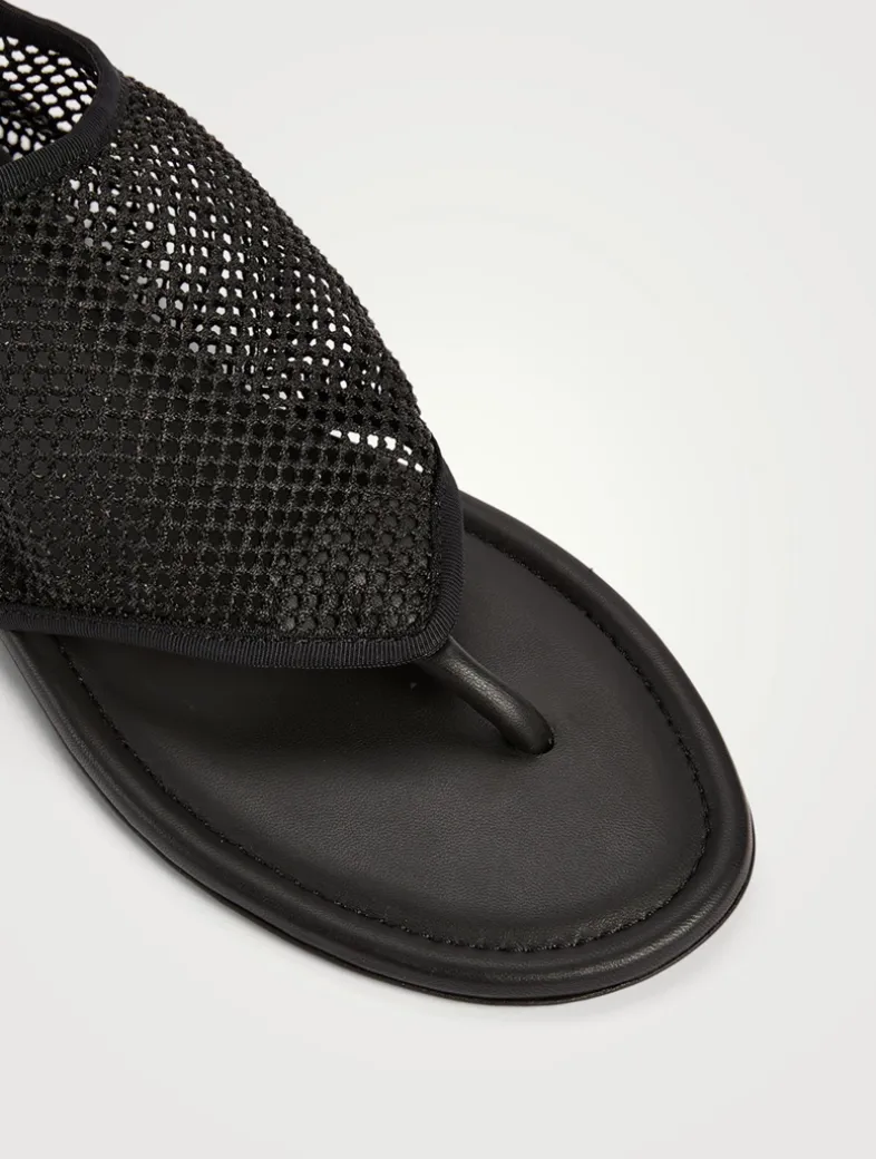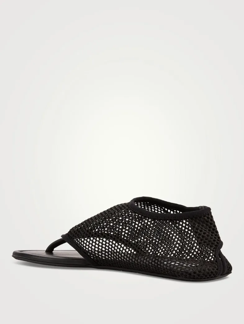 Flaunting a barely-there look, these thong-style flats are crafted from a fishnet fabric trimmed with leather.