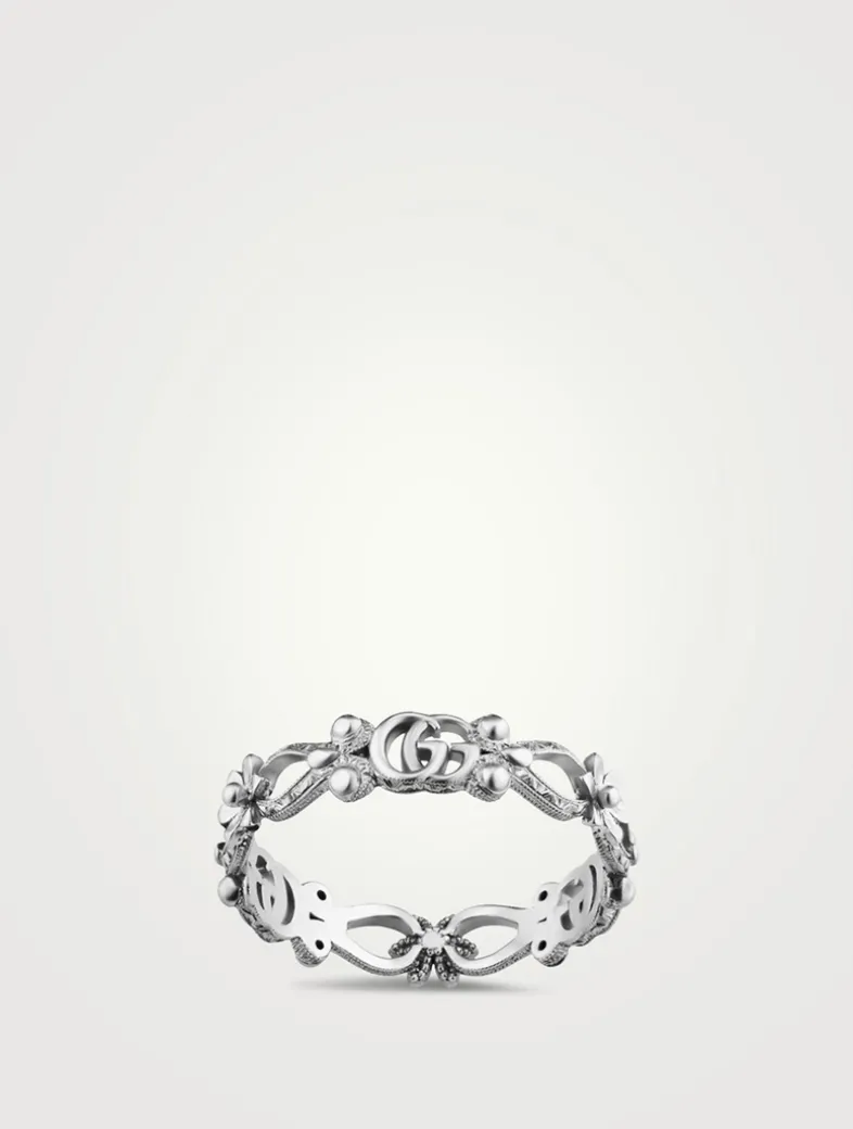 Made in Italy, this 18k gold band ring features the distinctive Double G House code and flower detailing around.