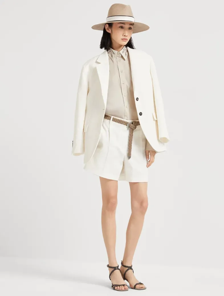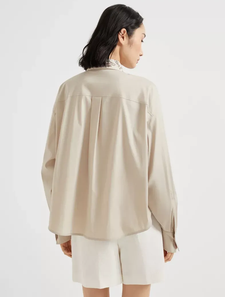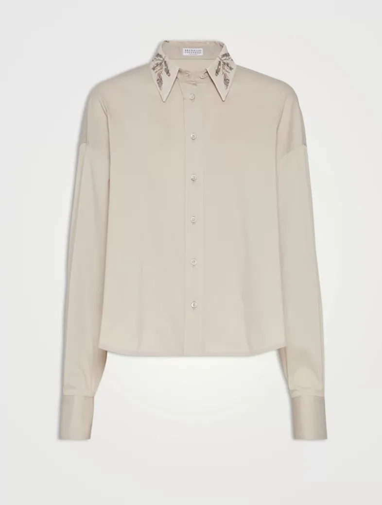 Stretch cotton poplin shirt with glistening flora embroidery collar