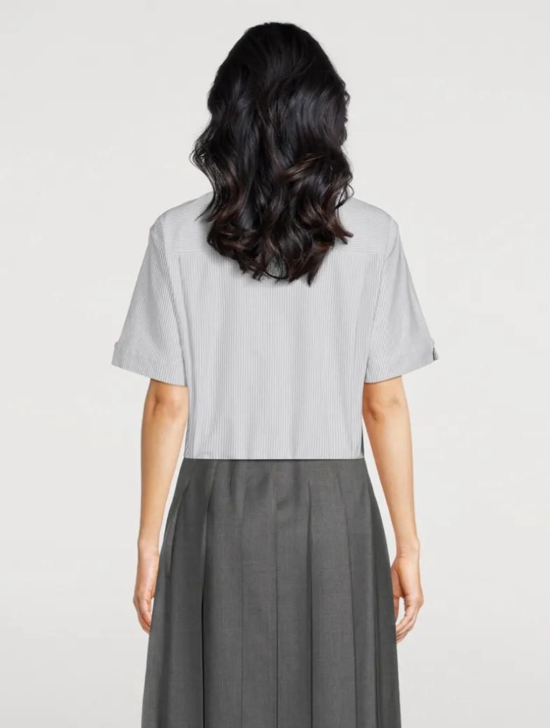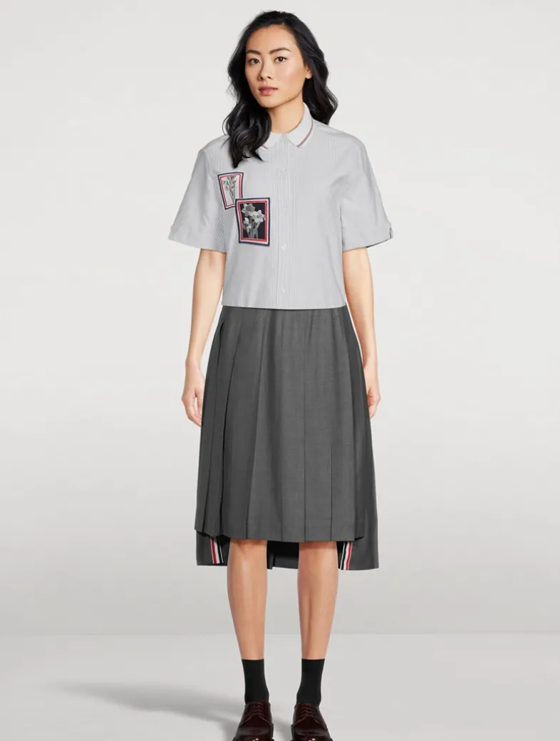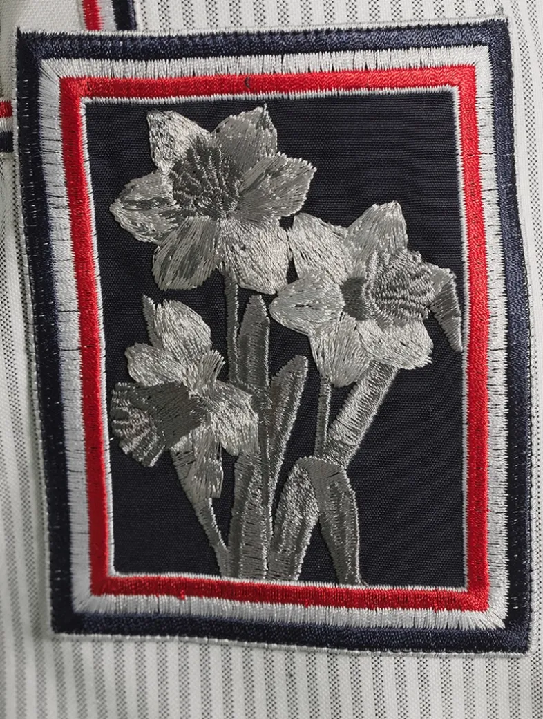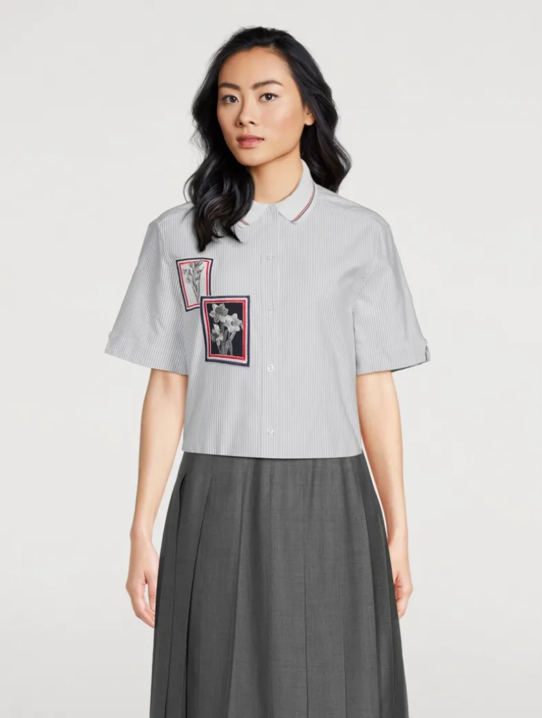 A pair of floral-embroidered patches highlights the chest of this tailored shirt. Crafted from crisp cotton poplin, it is printed with subtle pinstripes and topped with a stripe-trimmed collar. Short sleeves with split cuffs completes the look.
