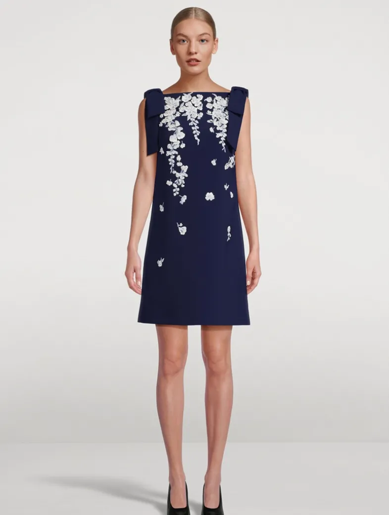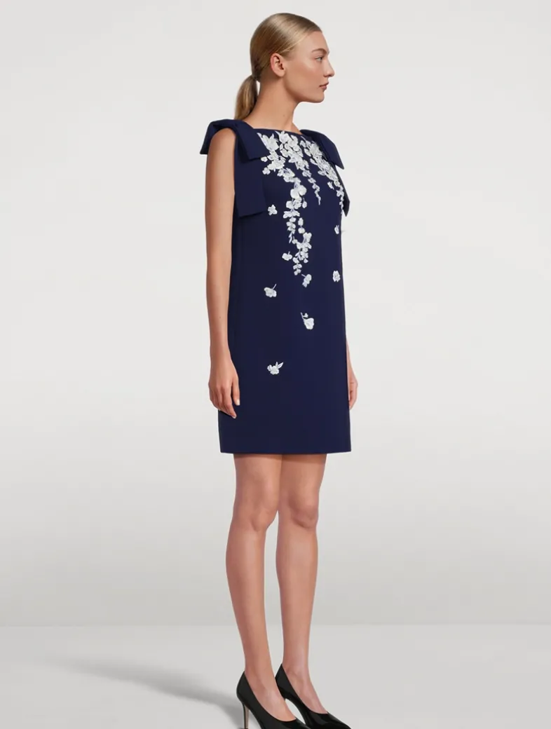 The classic shift is given an ultra-feminine twist with flirty bow shoulders and elaborate wisteria embroidery, realized in thread, crystal, and beads. Topped with a bateau neckline, it has a sleeveless, above-the-knee design.