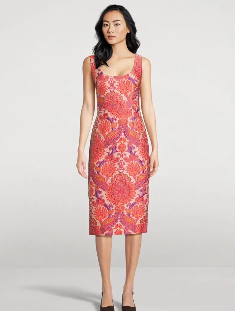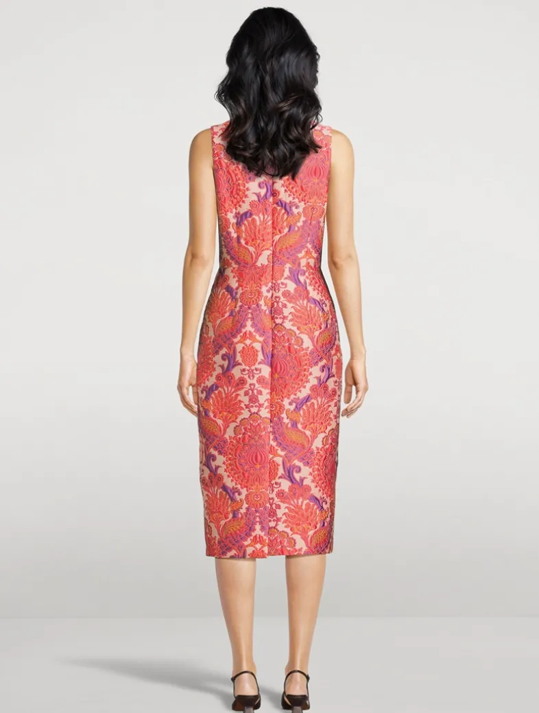 A sprawling floral jacquard motif lends a romantic touch to this dress. Cut in a curve-skimming sheath silhouette, it has a sleeveless bodice with a square neckline and a seamed waist that falls to a tailored pencil skirt.