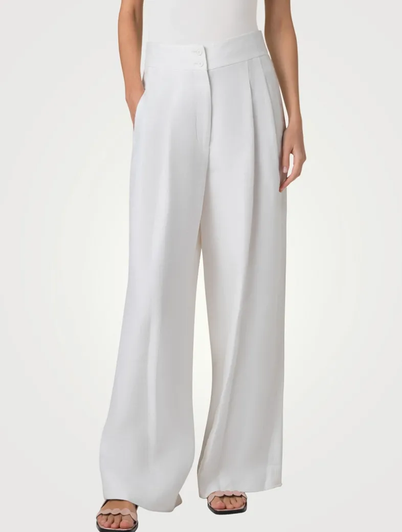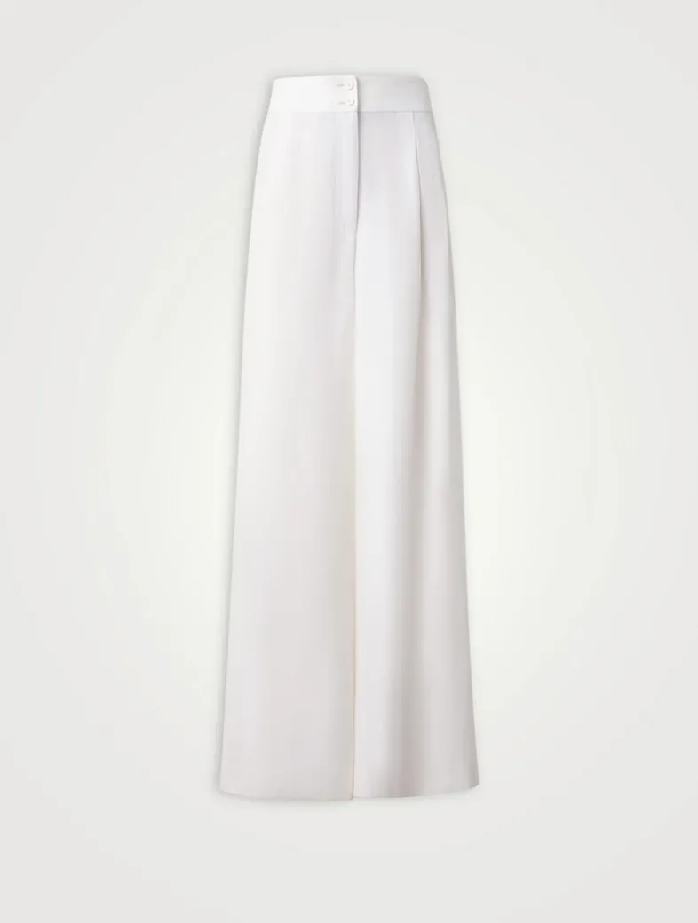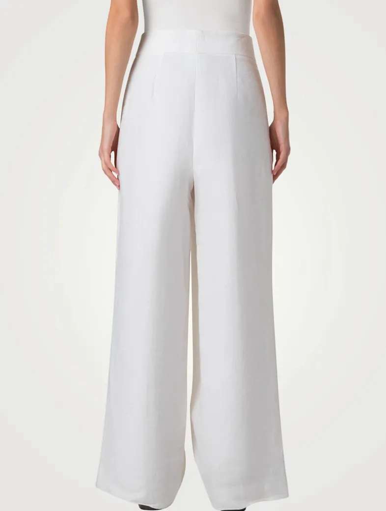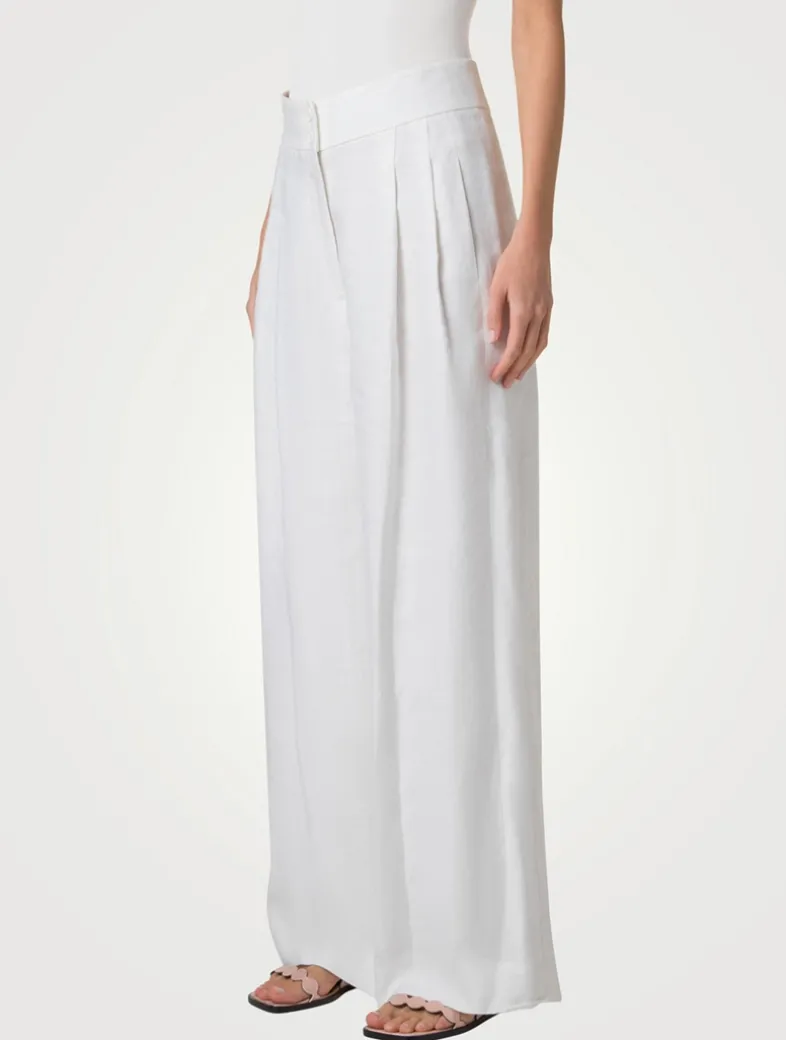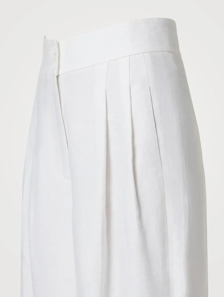 These trousers are crafted in a refined linen with a fluid drape. They are designed to sit high on the waist and feature full-length wide legs with front pleat details. Finished with side pockets.