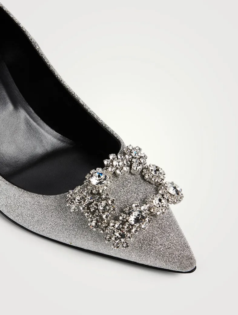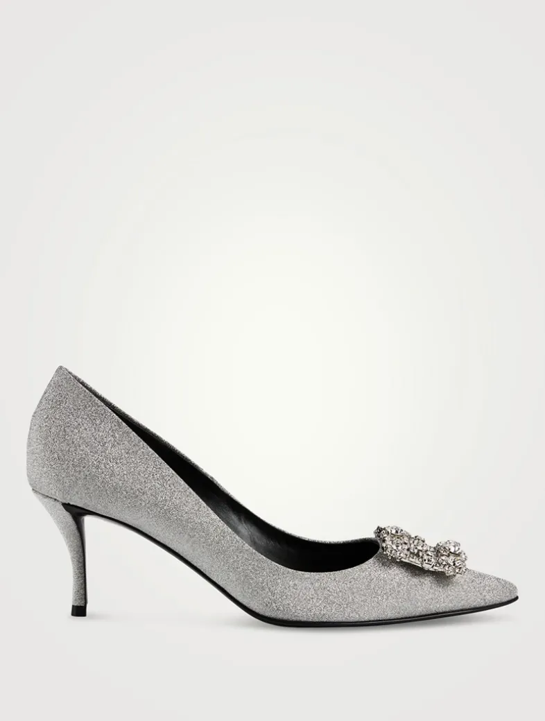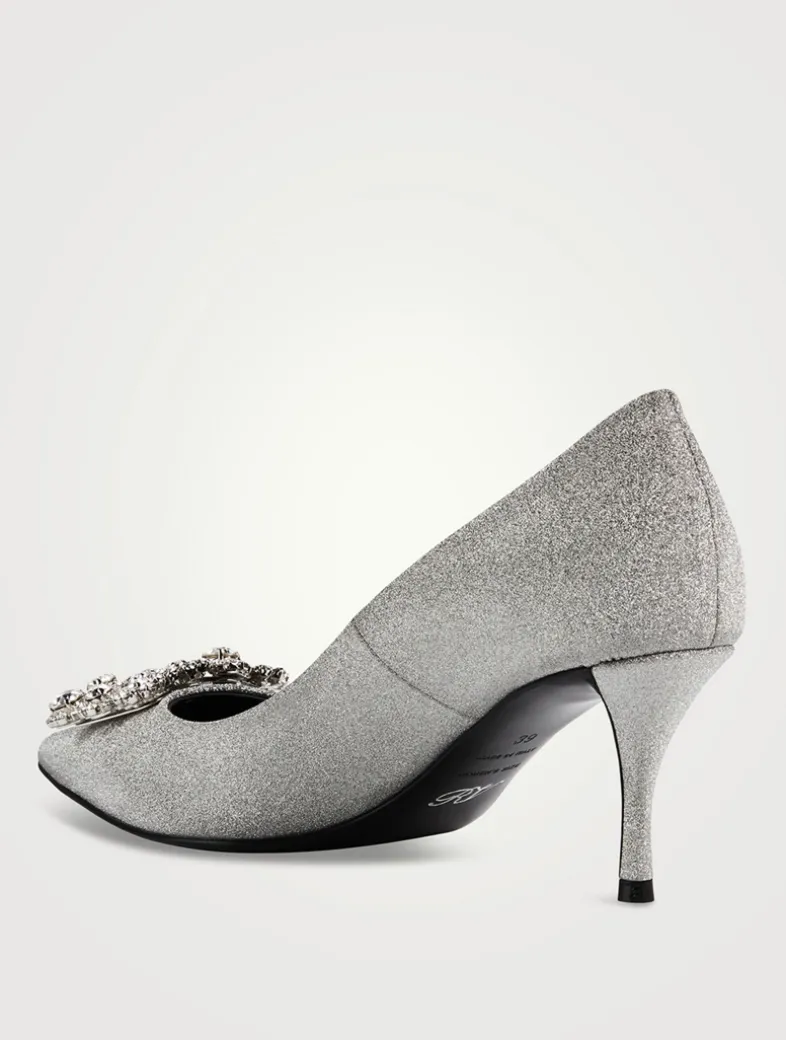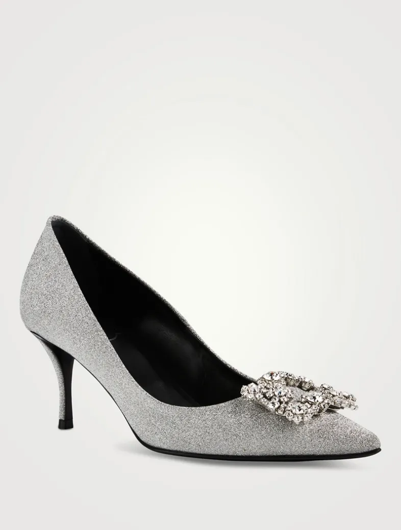 The Flower Strass pumps in glittered fabric are embellished with a jewelled buckle crafted in flower-shaped crystal appliqué and a vertiginous, yet thin, heel. A sophisticated and delicate creation for an important occasion.