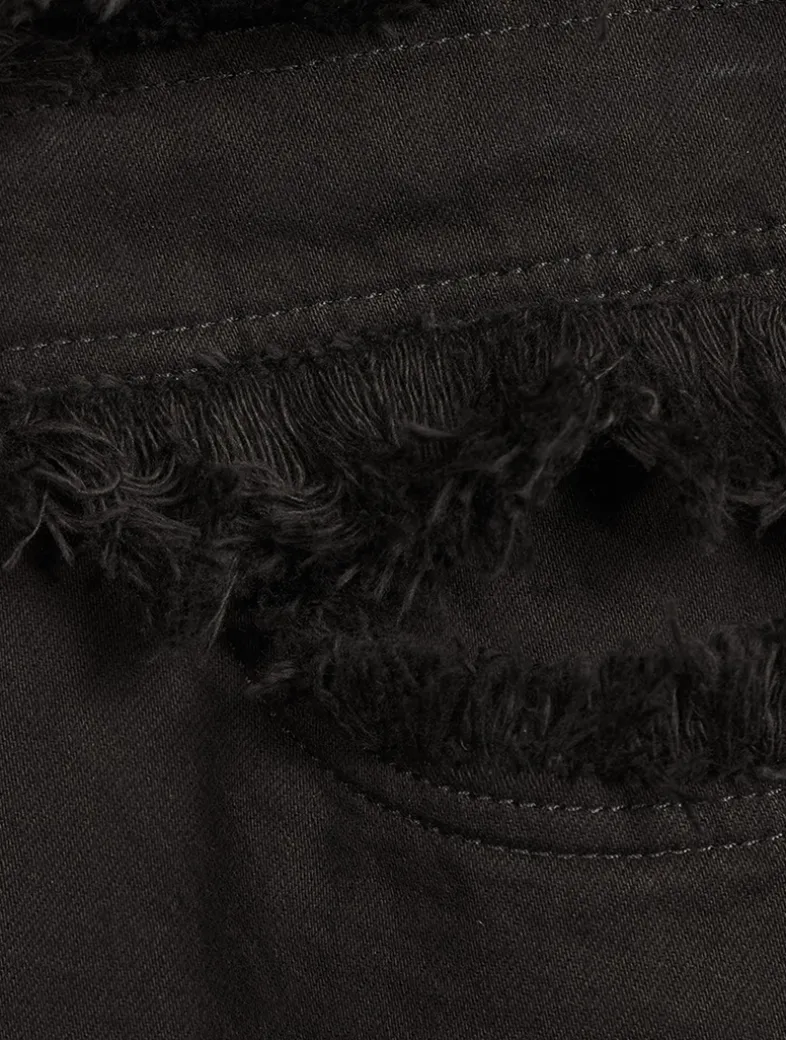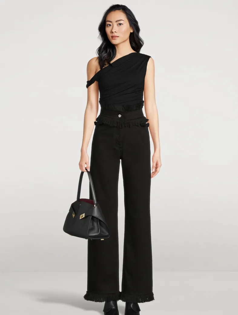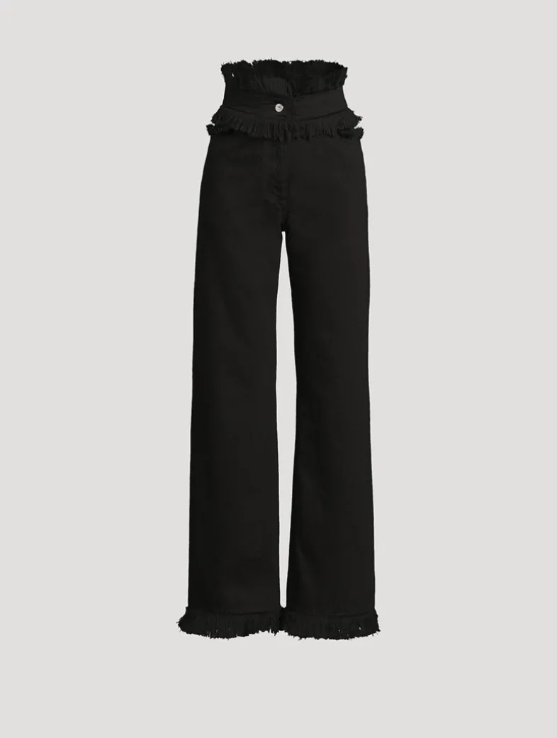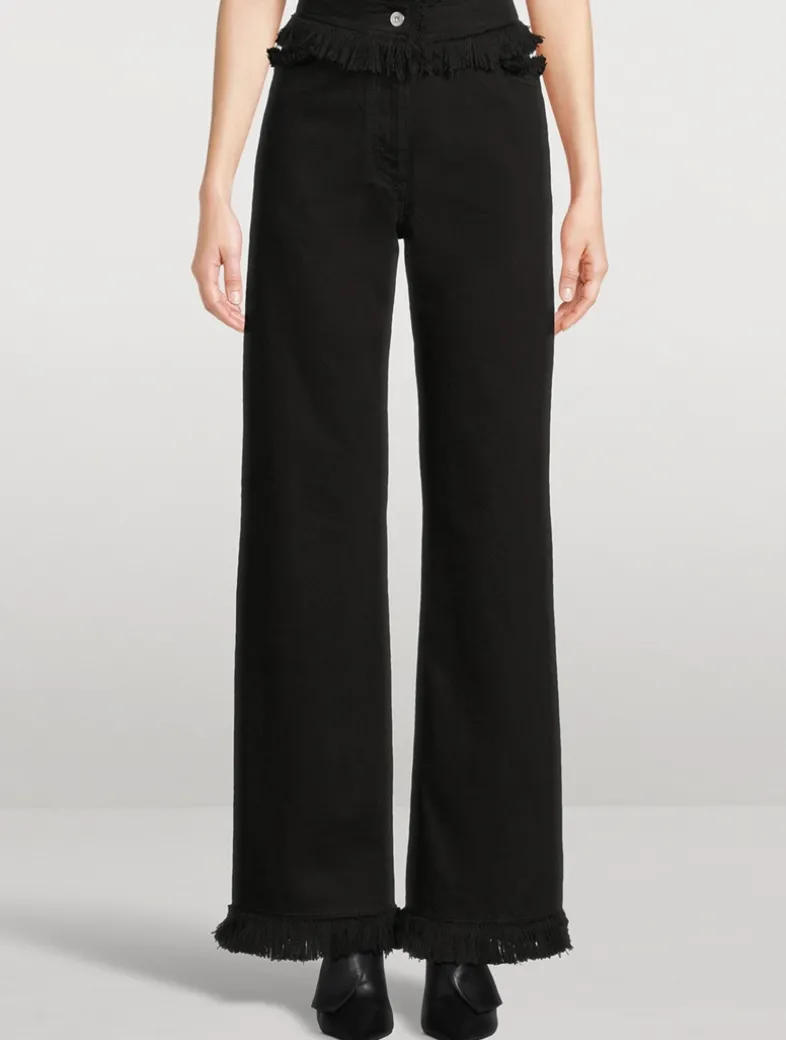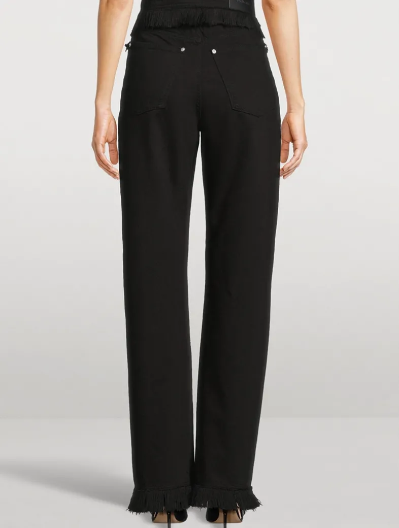 A classic five-pocket silhouette with a unique accent. Redesigned through the creative lens of Maximilian Davis, these jeans have a straight-cut wide leg with custom rivets and buttons. The fringed edges add a dynamic touch.
