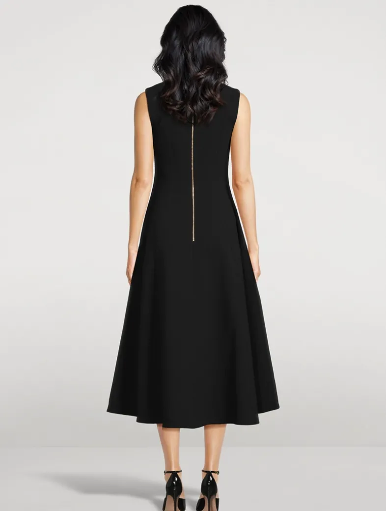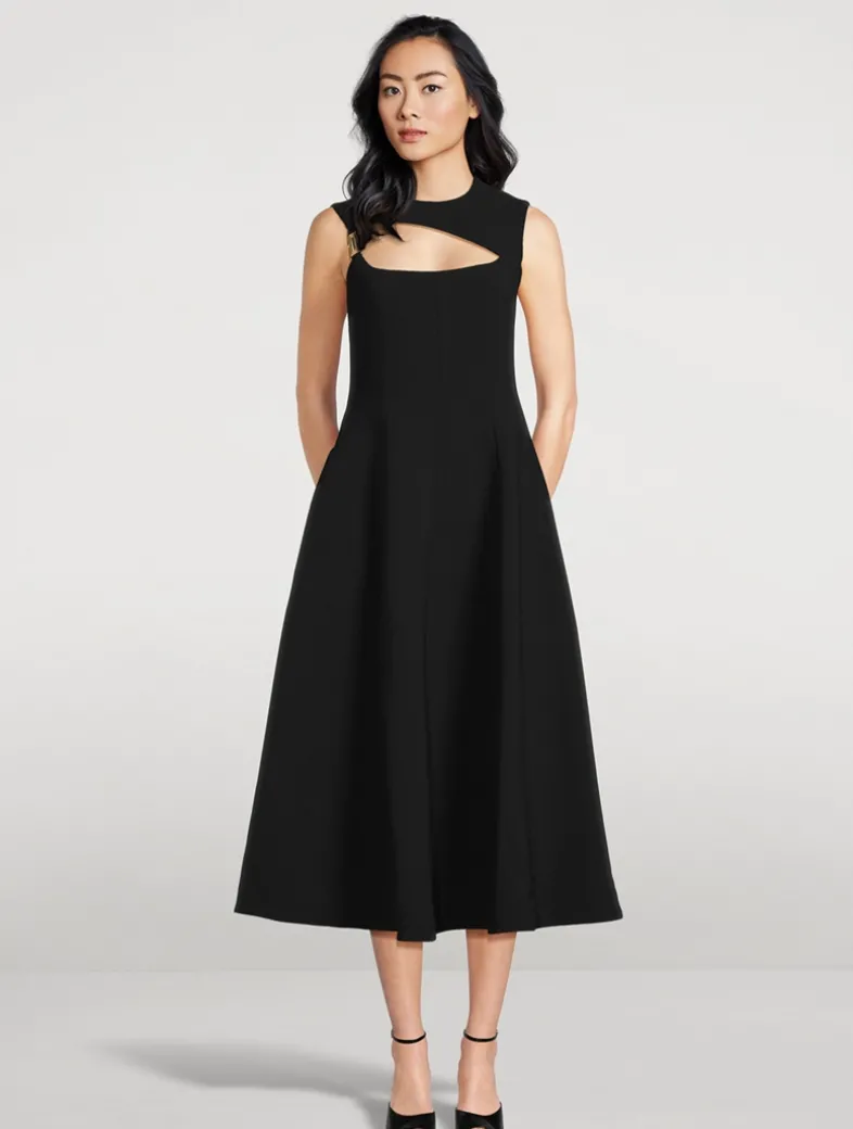 An asymmetric cut-out at the bust of this cocktail dress is embellished with metal hardware, to reveal a hint of skin and nod to Deco-inspired styles.