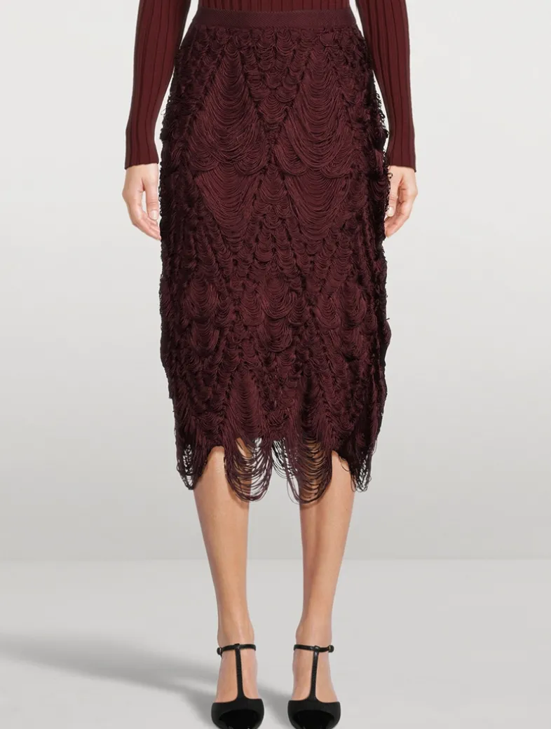 Layers of delicate fringe is draped along the body of this midi, lending an opulent touch to the piece. It is crafted from a silk-blend knit and cut to sit high on the waist with a slim-fit silhouette.